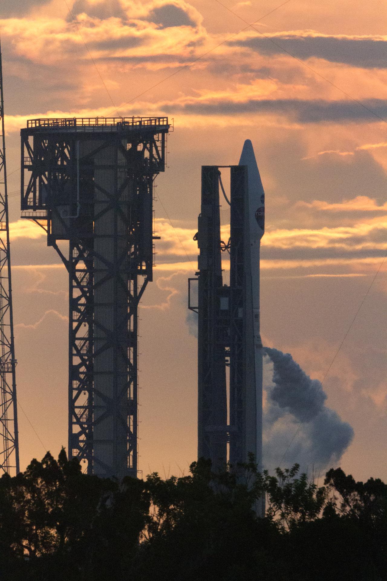 As the Sun rises at Space Launch Complex 41 at Cape Canaveral Air Force Station in Florida, a United Launch Alliance Atlas V rocket vents liquid oxygen propellant vapors during fueling for the lift off of NASA's Tracking and Data Relay Satellite, TDRS-M. The satellite is the latest spacecraft destined for the agency's constellation of communications satellites that allows nearly continuous contact with orbiting spacecraft ranging from the International Space Station and Hubble Space Telescope to the array of scientific observatories.