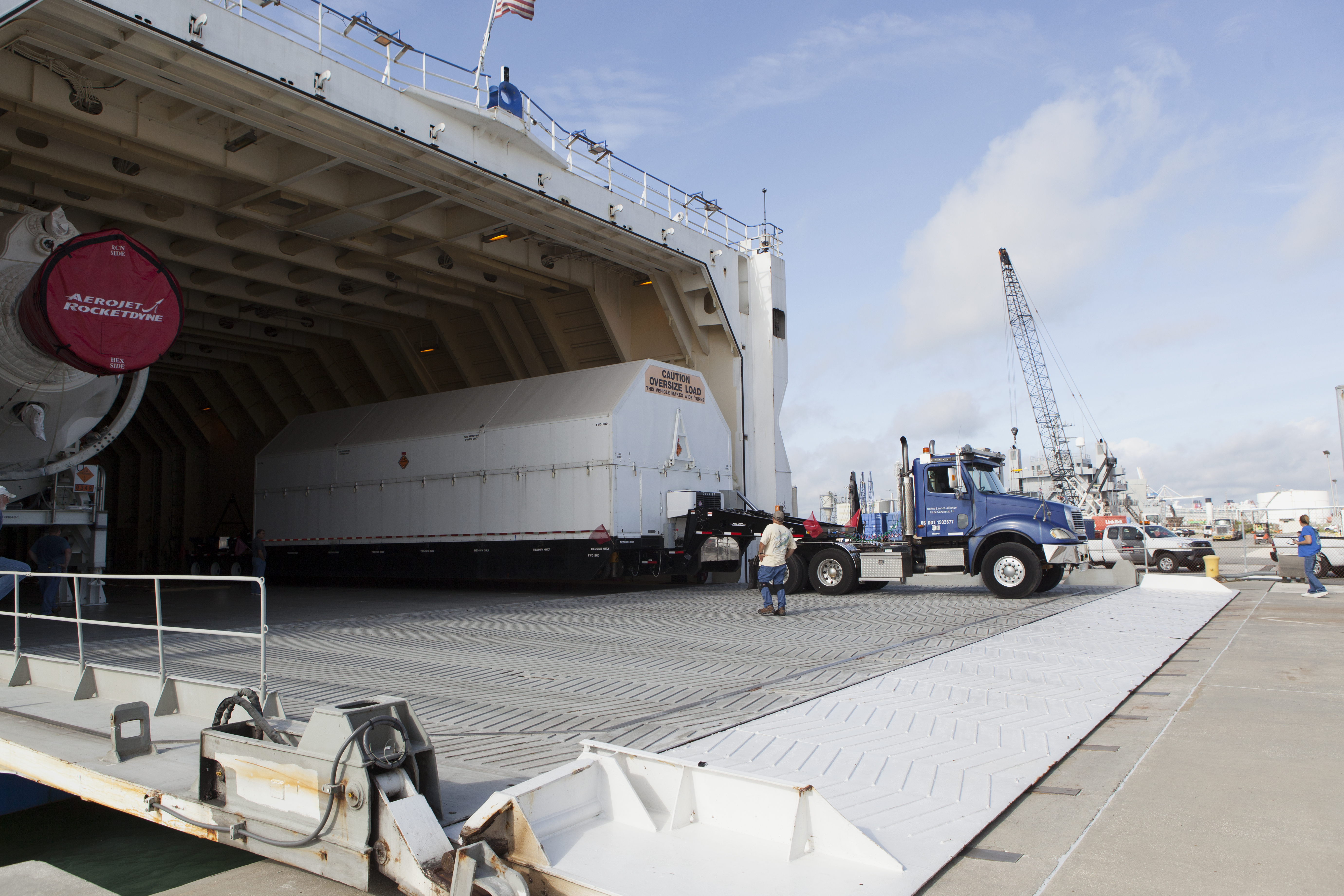 A United Launch Alliance Delta IV Heavy second stage, packaged in its shipping container, is offloaded from the company's Mariner ship at Port Canaveral in Florida. The Delta IV Heavy will launch NASA's upcoming Parker Solar Probe mission. The mission will perform the closest-ever observations of a star when it travels through the Sun's atmosphere, called the corona. The probe will rely on measurements and imaging to revolutionize our understanding of the corona and the Sun-Earth connection. Liftoff atop the Delta IV Heavy rocket is scheduled to take place from Cape Canaveral's Space Launch Complex 37 in summer 2018.
