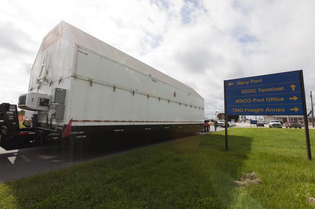 A United Launch Alliance Delta IV Heavy second stage, packaged in its shipping container, has been offloaded from the company's Mariner ship at Port Canaveral in Florida. It will be transported to the Horizontal Integration Facility at Cape Canaveral Air Force Station for preflight processing. The Delta IV Heavy will launch NASA's upcoming Parker Solar Probe mission. The mission will perform the closest-ever observations of a star when it travels through the Sun's atmosphere, called the corona. The probe will rely on measurements and imaging to revolutionize our understanding of the corona and the Sun-Earth connection. Liftoff atop the Delta IV Heavy rocket is scheduled to take place from Cape Canaveral's Space Launch Complex 37 in summer 2018.