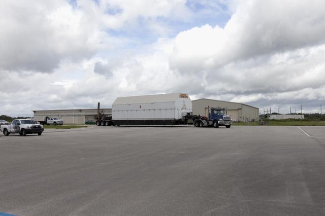 A United Launch Alliance Delta IV Heavy second stage, packaged in its shipping container, arrives at the Horizontal Integration Facility at Cape Canaveral Air Force Station for preflight processing. The Delta IV Heavy will launch NASA's upcoming Parker Solar Probe mission. The mission will perform the closest-ever observations of a star when it travels through the Sun's atmosphere, called the corona. The probe will rely on measurements and imaging to revolutionize our understanding of the corona and the Sun-Earth connection. Liftoff atop the Delta IV Heavy rocket is scheduled to take place from Cape Canaveral's Space Launch Complex 37 in summer 2018.