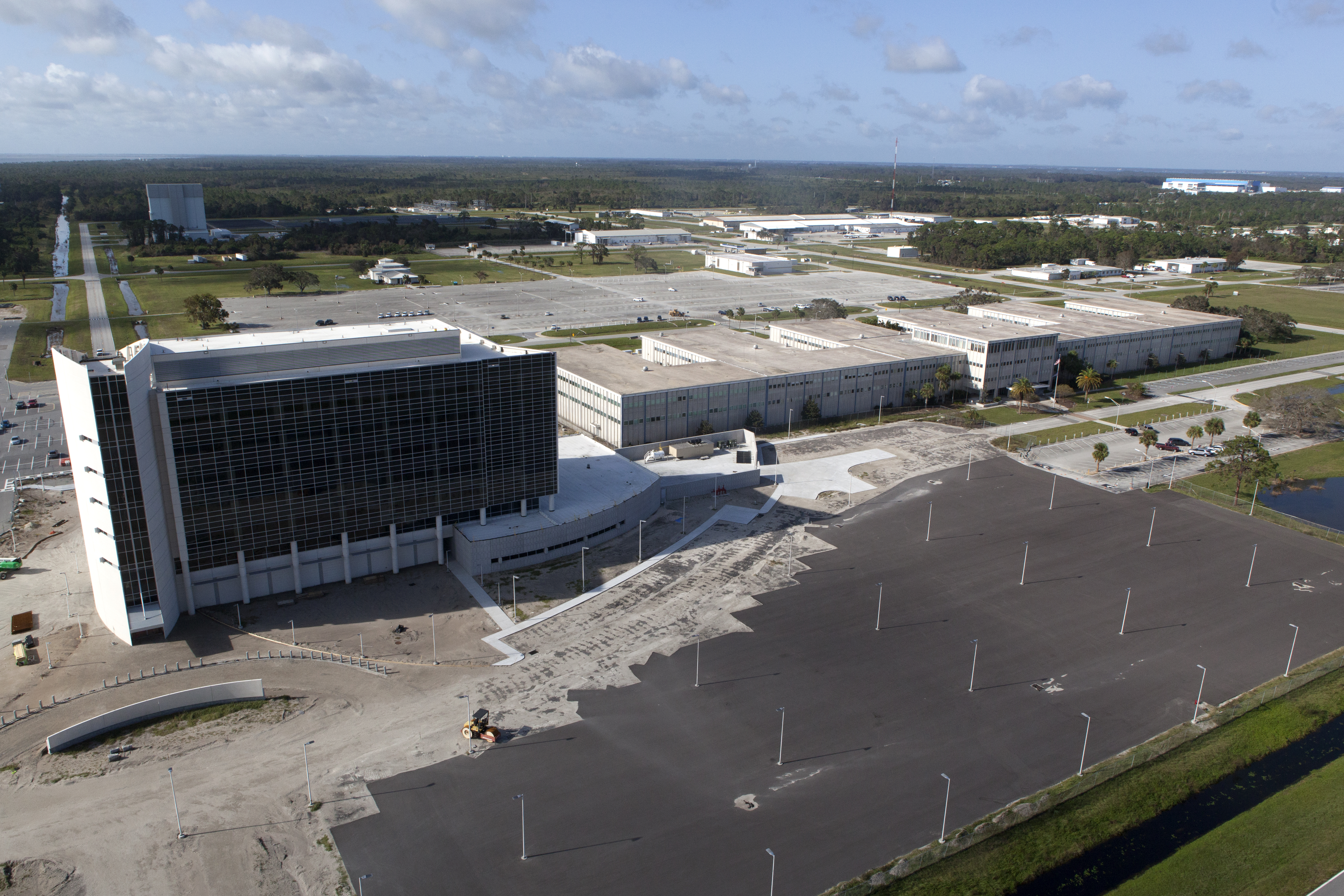 The Central Campus construction site and Headquarters building are seen during an aerial survey of NASA's Kennedy Space Center in Florida on September 12, 2017. The survey was performed to identify structures and facilities that may have sustained damage from Hurricane Irma as the storm passed Kennedy on September 10, 2017. NASA closed the center ahead of the storm's onset and only a small team of specialists known as the Rideout Team was on the center as the storm approached and passed.