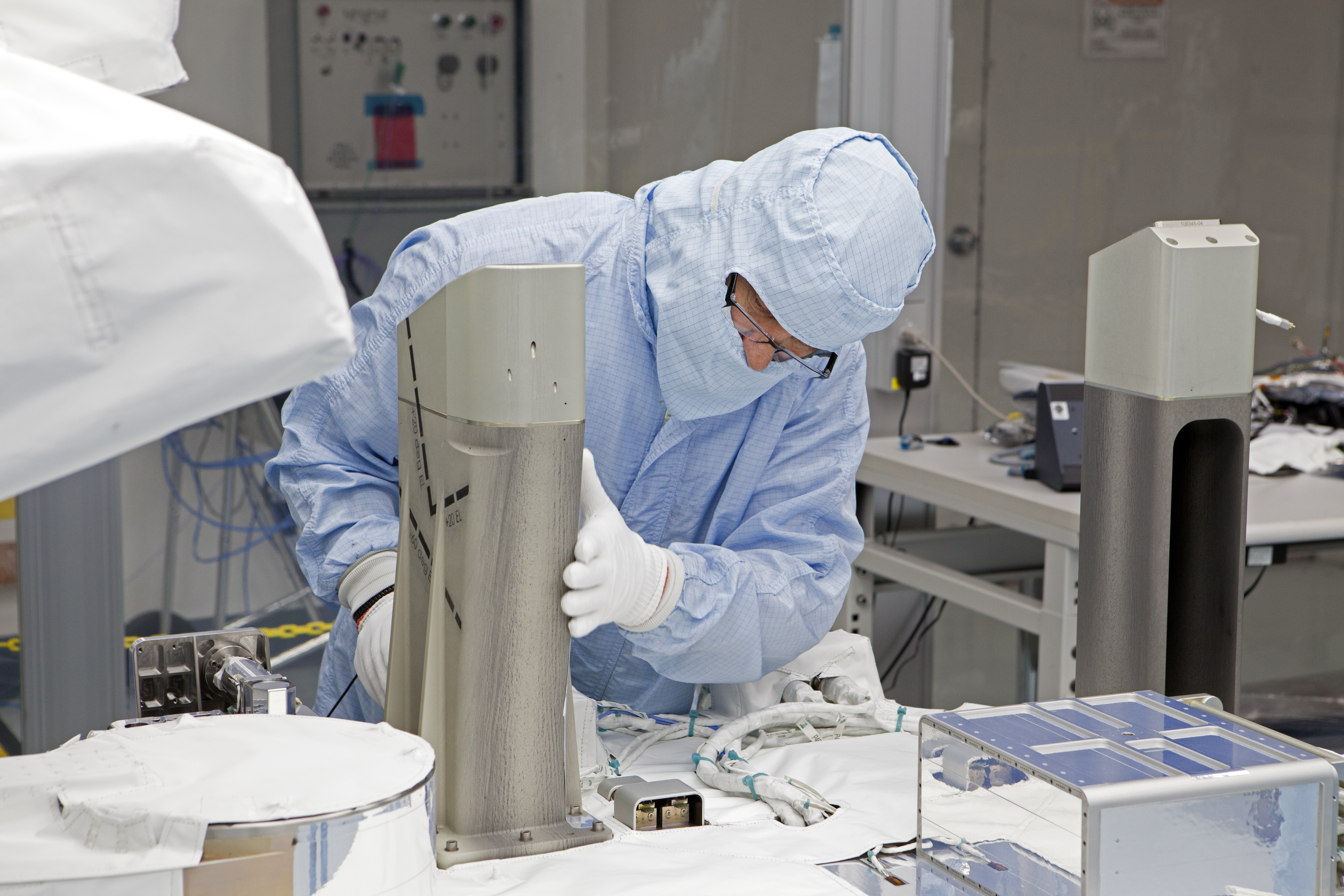 In the high bay of Kennedy Space Center's Space Station Processing Facility, Chris Hardcastle of Stinger-Ghaffarian Technologies performs a sharp edge inspection of the integrated Total and Spectral Solar Irradiance Sensor-1 (TSIS-1) payload and the EXPRESS Pallet Adapter. TSIS-1 is designed to measure the Sun's energy input into Earth by seeing how it is distributed across different wavelengths of light. These measurements help scientists establish Earth's total energy and how our planet's atmosphere responds to changes in the Sun's energy output. TSIS-1 will launch on SpaceX's 13th commercial resupply mission to the International Space Station.