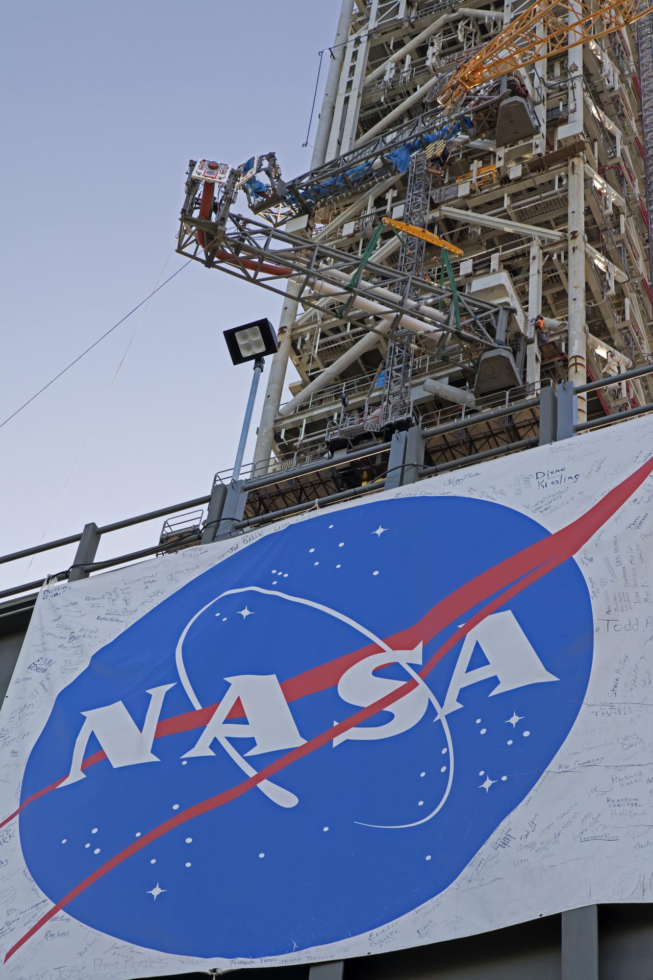 A heavy-lift crane moves the Core Stage Inter-tank Umbilical (CSITU) up to about the 140-foot level of the mobile launcher (ML) tower at NASA's Kennedy Space Center in Florida. The CSITU is moved into place for a fit check of the attachment hardware. The umbilical will be lowered down and installed permanently on the ML at a later date. The CSITU is a swing-arm umbilical that will connect to the Space Launch System core stage inter-tank. It will provide conditioned air, pressurized gases and power and data connection to the core stage. The Ground Systems Development and Operations Program is overseeing installation of the umbilicals.