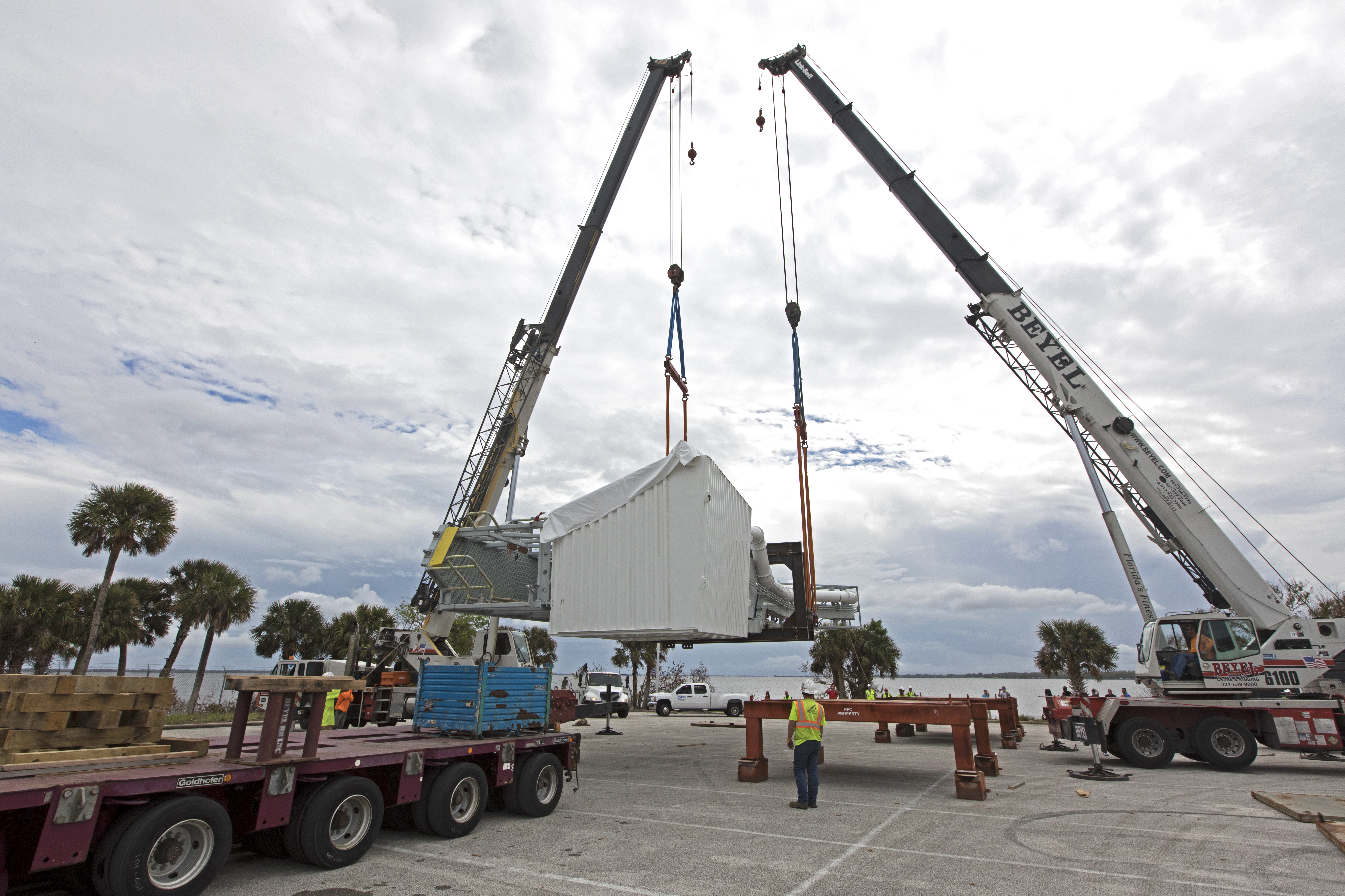 Two heavy-lift cranes are used to lift the Orion crew access arm up from a flatbed truck in a storage location at NASA's Kennedy Space Center in Florida. The access arm was transported from Precision Fabricating and Cleaning in Cocoa, Florida. Later this month, the arm will be transported to the mobile launcher (ML) tower at the center. The crew access arm will be located at about the 274-foot level on the tower. It will rotate from its retracted position and interface with the Orion crew hatch location to provide entry to the Orion crew module. The Ground Systems Development and Operations Program is overseeing installation of umbilicals and launch accessories on the ML tower.