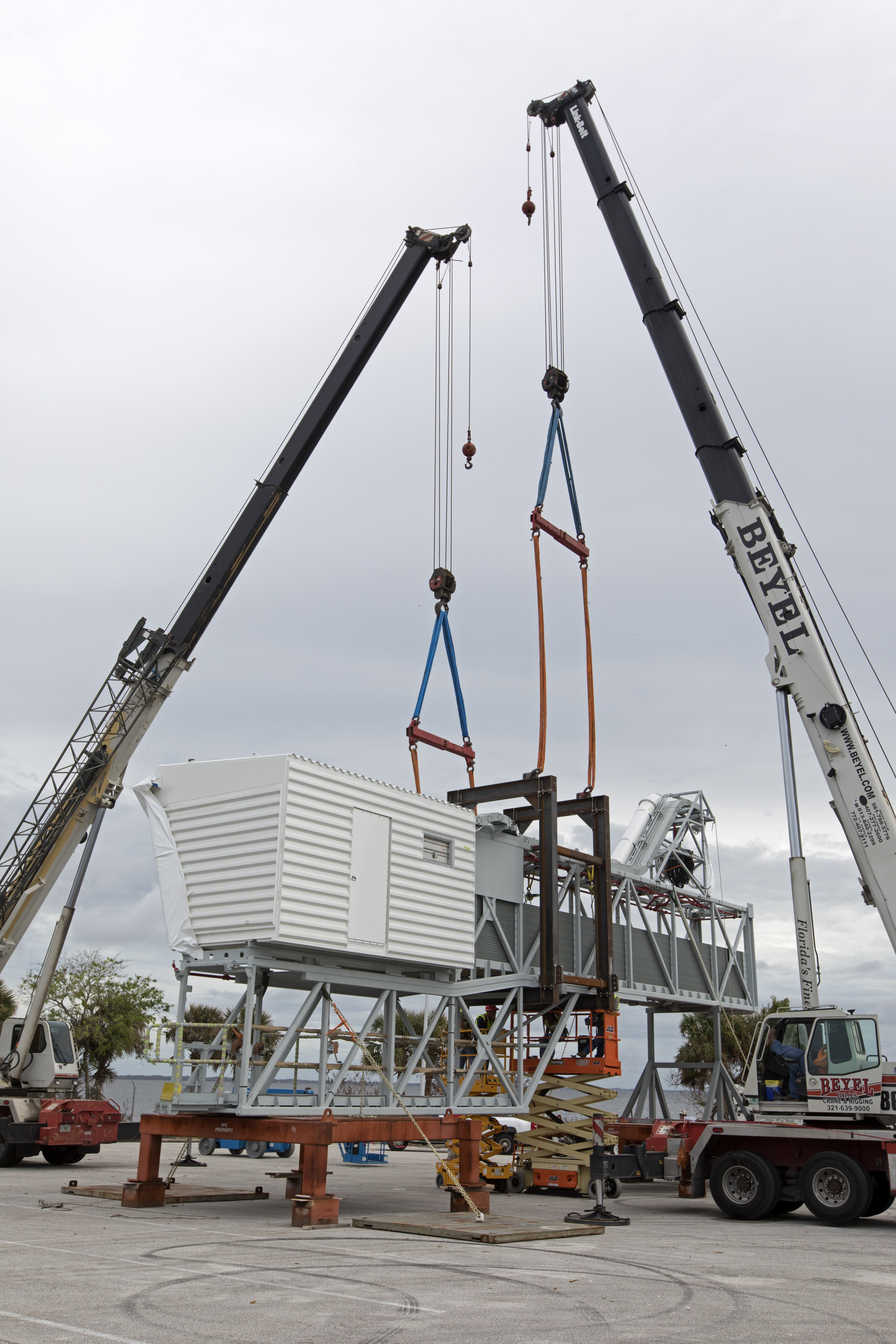 Two heavy-lift cranes lower the Orion crew access arm onto a work stand in a storage location at NASA's Kennedy Space Center in Florida. The access arm was transported from Precision Fabricating and Cleaning in Cocoa, Florida. Later this month, the arm will be transported to the mobile launcher (ML) tower at the center. The crew access arm will be located at about the 274-foot level on the tower. It will rotate from its retracted position and interface with the Orion crew hatch location to provide entry to the Orion crew module. The Ground Systems Development and Operations Program is overseeing installation of umbilicals and launch accessories on the ML tower.