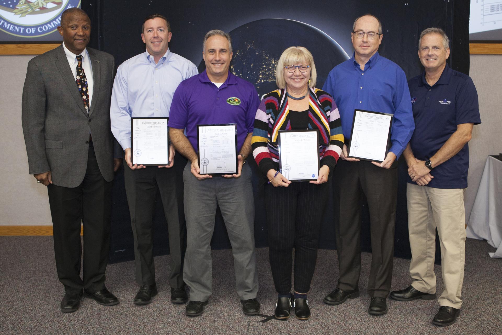 U.S. Patent plaques were awarded to, second from left, Luke Roberson, Trent Smith, Martha Williams and James Fesmire, for their invention, Aerogel/Polymer Composite Materials, known as Aeroplastic, during the 2017 Innovation Expo at NASA's Kennedy Space Center in Florida. At left is Kelvin Manning, Kennedy's associate director; and at far right is Dave Makufka, Kennedy's Technology Transfer Program manager. The purpose of the annual two-day expo is to help foster innovation and creativity among the Kennedy workforce. The event included several keynote speakers, training opportunities, an innovation showcase and the KSC Kickstart competition.