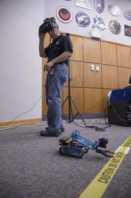 A worker tries out a virtual reality experience during the 2017 Innovation Expo at NASA's Kennedy Space Center in Florida. The purpose of the annual two-day event is to help foster innovation and creativity among the Kennedy workforce. The event included several keynote speakers, training opportunities, an innovation showcase and the KSC Kickstart competition.
