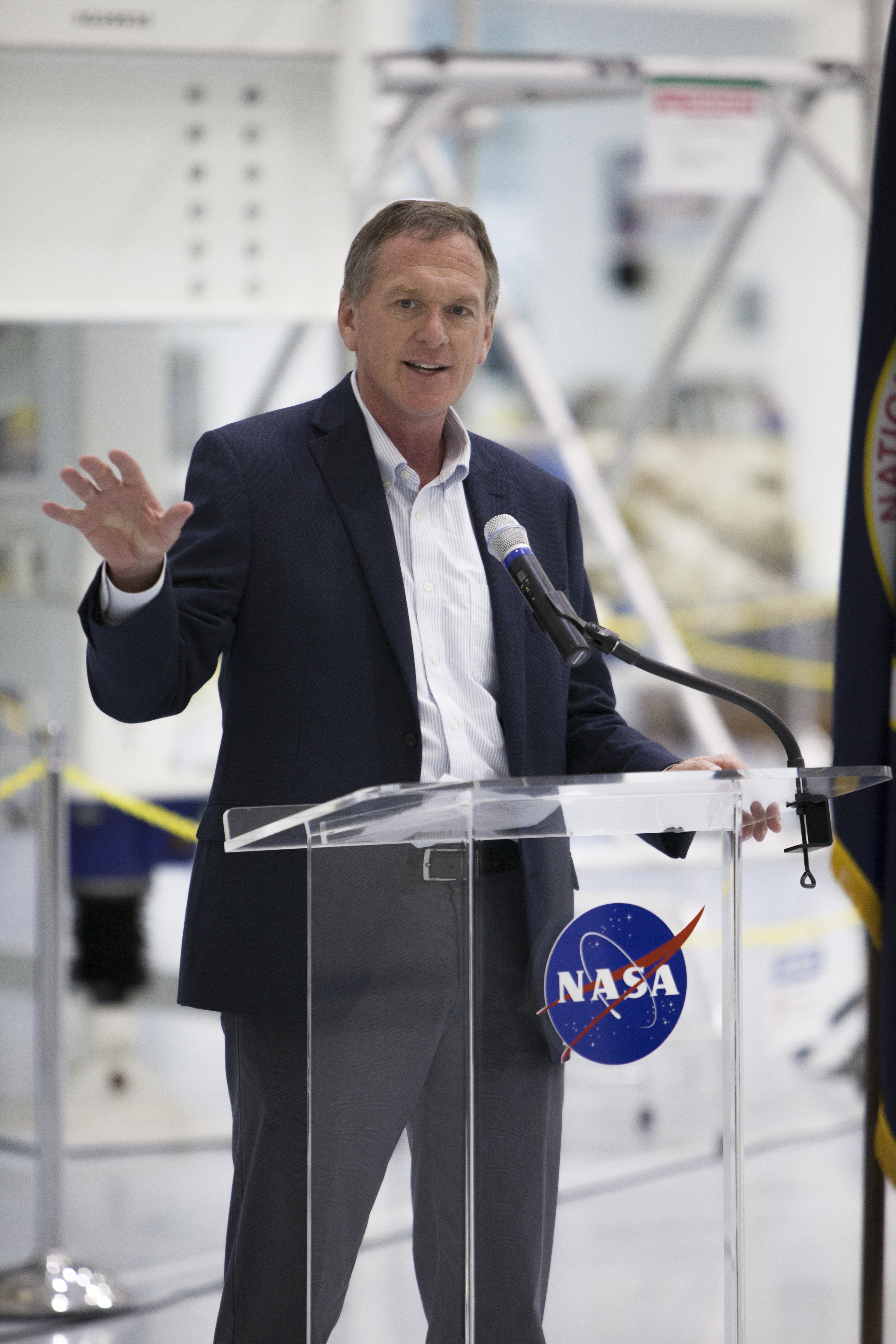 Mike Bolger, Ground Systems Development and Operations Program manager at NASA's Kennedy Space Center, speaks to guests during a ceremony in the high bay of the Space Station Processing Facility. The event marked the milestone of the Space Launch System rocket's Interim Cryogenic Propulsion Stage (ICPS) being turned over from NASA's Spacecraft/Payload Integration and Evolution organization to the spaceport's Ground Systems Development and Operations directorate. The ICPS is the first integrated piece of flight hardware to arrive in preparation for the uncrewed Exploration Mission-1.