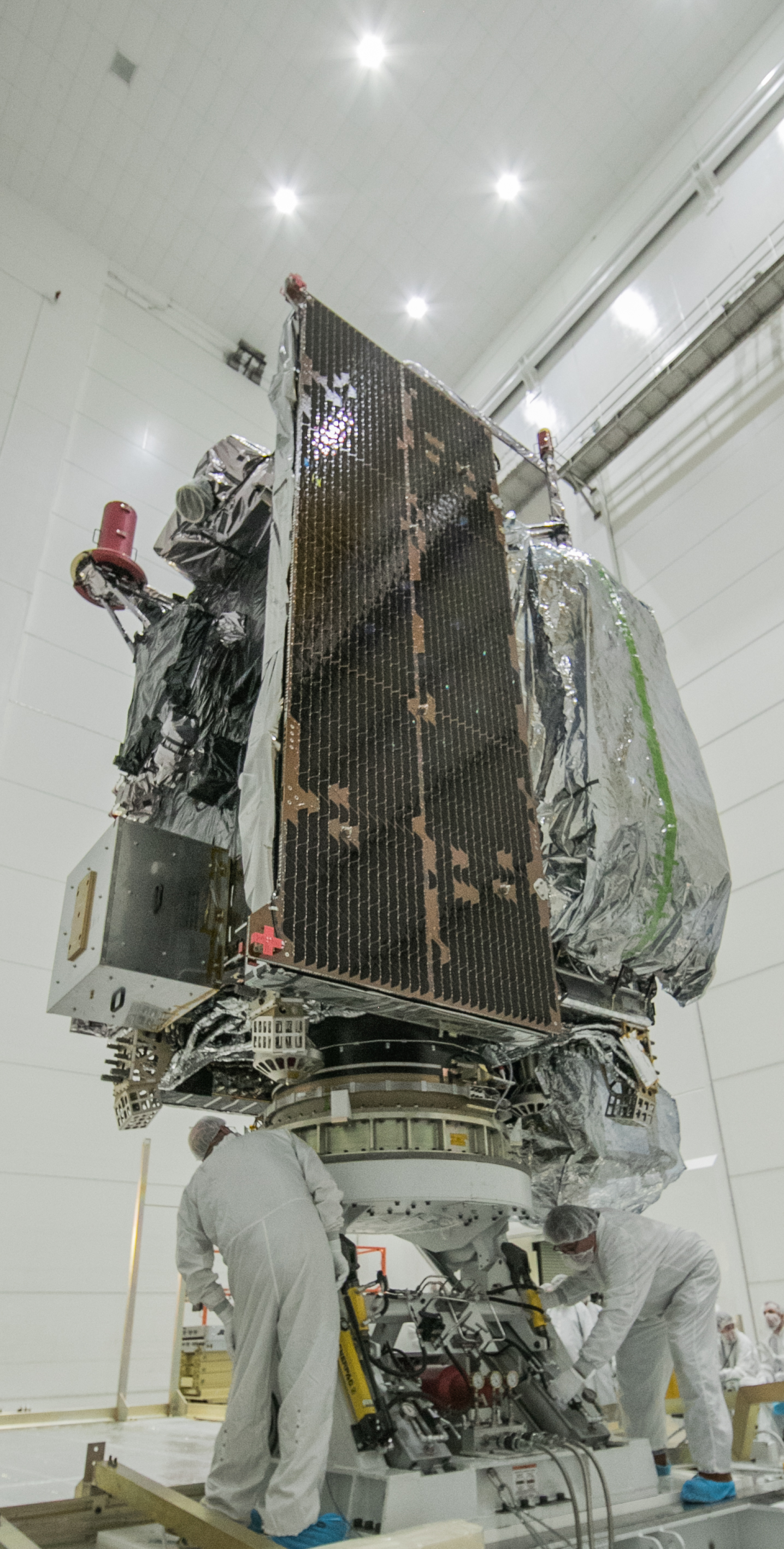At Astrotech Space Operations in Titusville, Florida, technicians and engineers inspect NOAA's Geostationary Operation Environmental Satellite-S (GOES-S) after removal from its shipping container. GOES-S is the second in a series of four advanced geostationary weather satellites. The GOES-R series - consisting of the GOES-R, GOES-S, GOES-T and GOES-U spacecraft - will significantly improve the detection and observation of environmental phenomena that directly affect public safety, protection of property and the nation's economic health and prosperity. GOES-S is slated to launch March 1, 2018 aboard a United Launch Alliance Atlas V rocket from Cape Canaveral Air Force Station in Florida.
