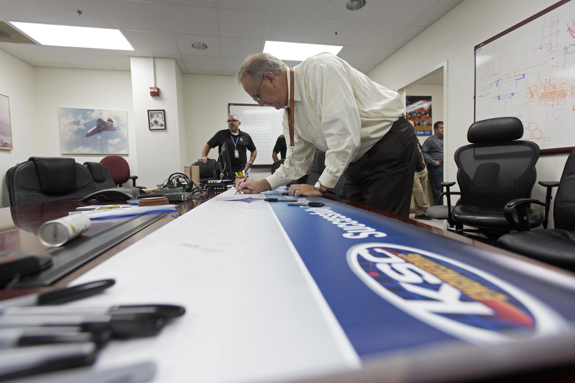NASA Kennedy Space Center's Engineering Director Pat Simpkins signs the banner marking the successful delivery of a liquid oxygen test tank, called Tardis, in the Prototype Development Laboratory at NASA's Kennedy Space Center in Florida. Engineers and technicians worked together to develop the tank and build it to support cryogenic testing at Johnson Space Center's White Stands Test Facility in Las Cruces, New Mexico. The 12-foot-tall, 3,810-pound aluminum tank will be shipped to White Sands for testing.
