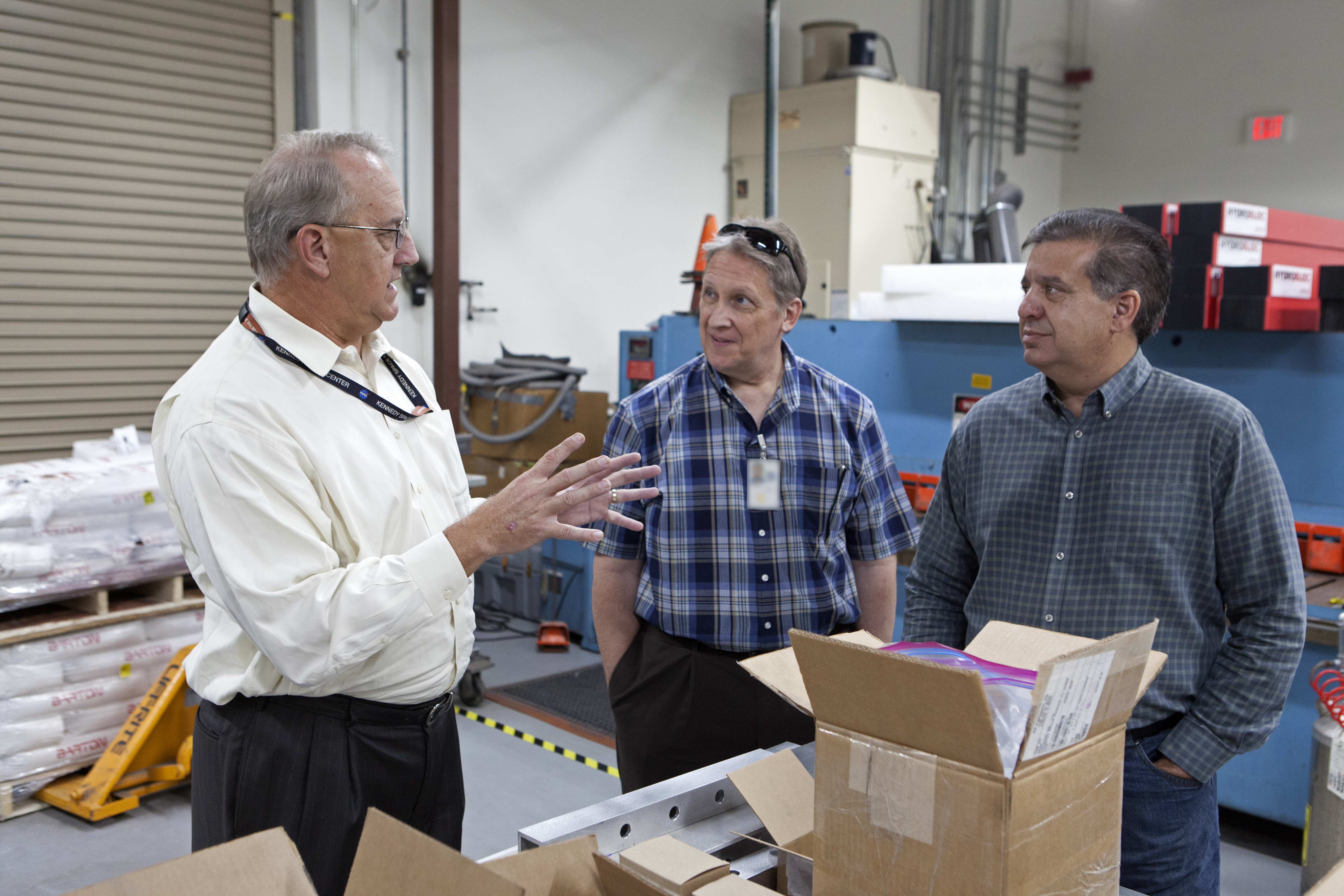 NASA Kennedy Space Center's Engineering Director Pat Simpkins, at left, talks with Michael E. Johnson, a project engineer; and Emilio Cruz, deputy division chief in the Laboratories, Development and Testing Division, inside the Prototype Development Laboratory. A banner signing event was held to mark the successful delivery of a liquid oxygen test tank, called Tardis. Engineers and technicians worked together to develop the tank and build it at the lab to support cryogenic testing at Johnson Space Center's White Sands Test Facility in Las Cruces, New Mexico. The 12-foot-tall, 3,810-pound aluminum tank will be shipped to White Sands for testing.
