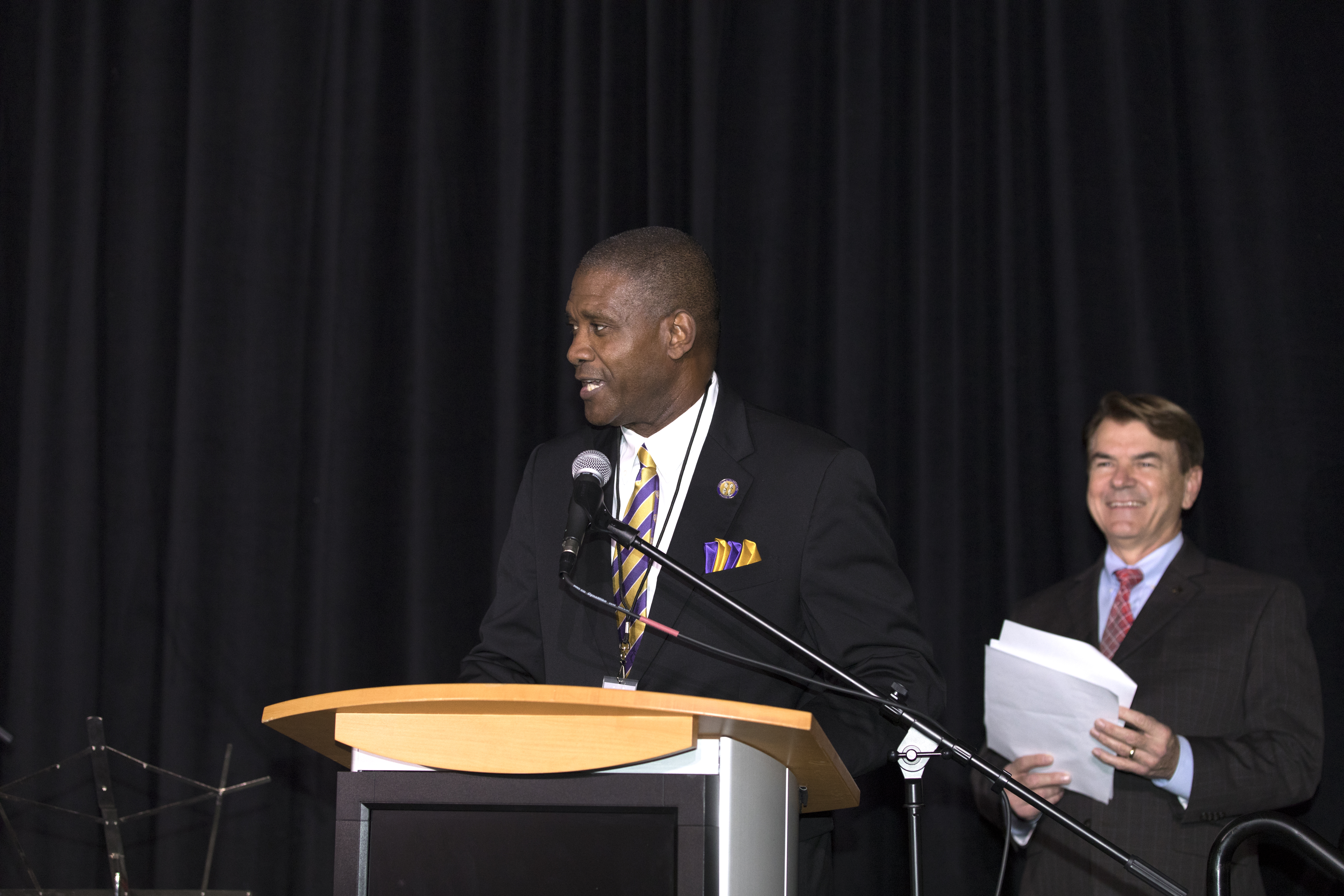 Former Florida State Sen. Tony Hill speaks during an Astronauts Memorial Foundation tribute honoring U.S. Air Foce Maj. Robert Lawrence. Looking on is State Rep. Thad Altman, president of the AMF. Selected in 1967 for the Manned Orbiting Laboratory Program, Lawrence was the first African-American astronaut. He lost his life in a training accident 50 years ago. The ceremony took place in the Center for Space Education at the Kennedy Space Center Visitor Complex.
