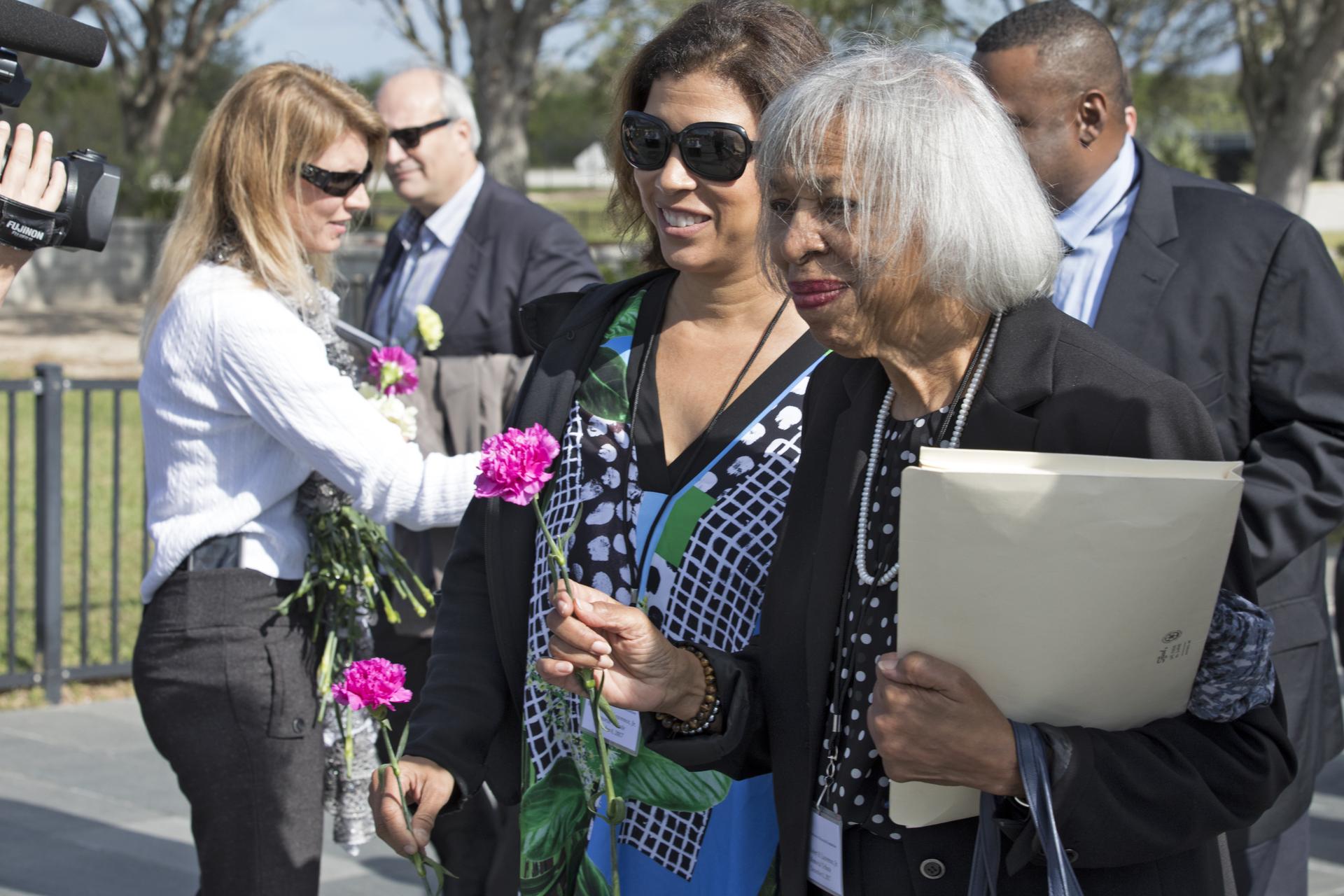 During an Astronauts Memorial Foundation tribute honoring U.S. Air Foce Maj. Robert Lawrence, his sister, Barbara Lawrence, Ph.D., places a flower at the Space Mirror Memorial which honors those lost in efforts to explore space. Selected in 1967 for the Manned Orbiting Laboratory Program, Lawrence was the first African-American astronaut. He lost his life in a training accident 50 years ago. The ceremony took place in the Center for Space Education at the Kennedy visitor complex.