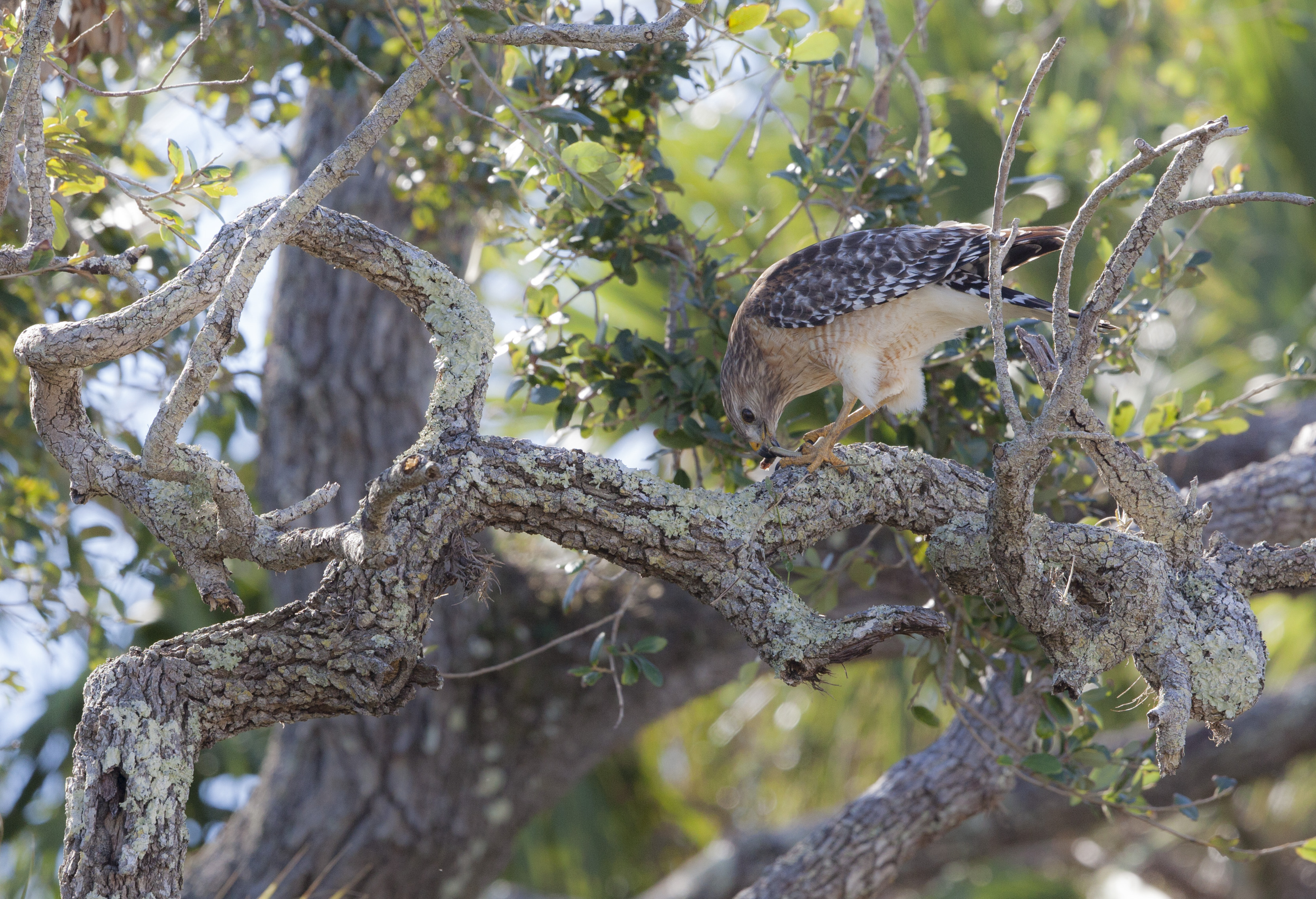 A red-shouldered hawk sits on a tree branch while snacking on a snake at NASA’s Kennedy Space Center in Florida. Kennedy shares a boundary with the Merritt Island National Wildlife Refuge. The Refuge encompasses 140,000 acres that are a habitat for more than 331 species of birds, 31 mammals, 117 fishes, and 65 amphibians and reptiles. The marshes and open water of the refuge provide wintering areas for 23 species of migratory waterfowl, as well as a year-round home for great blue herons, great egrets, wood storks, cormorants, brown pelicans and other species of marsh and shore birds, as well as a variety of insects.