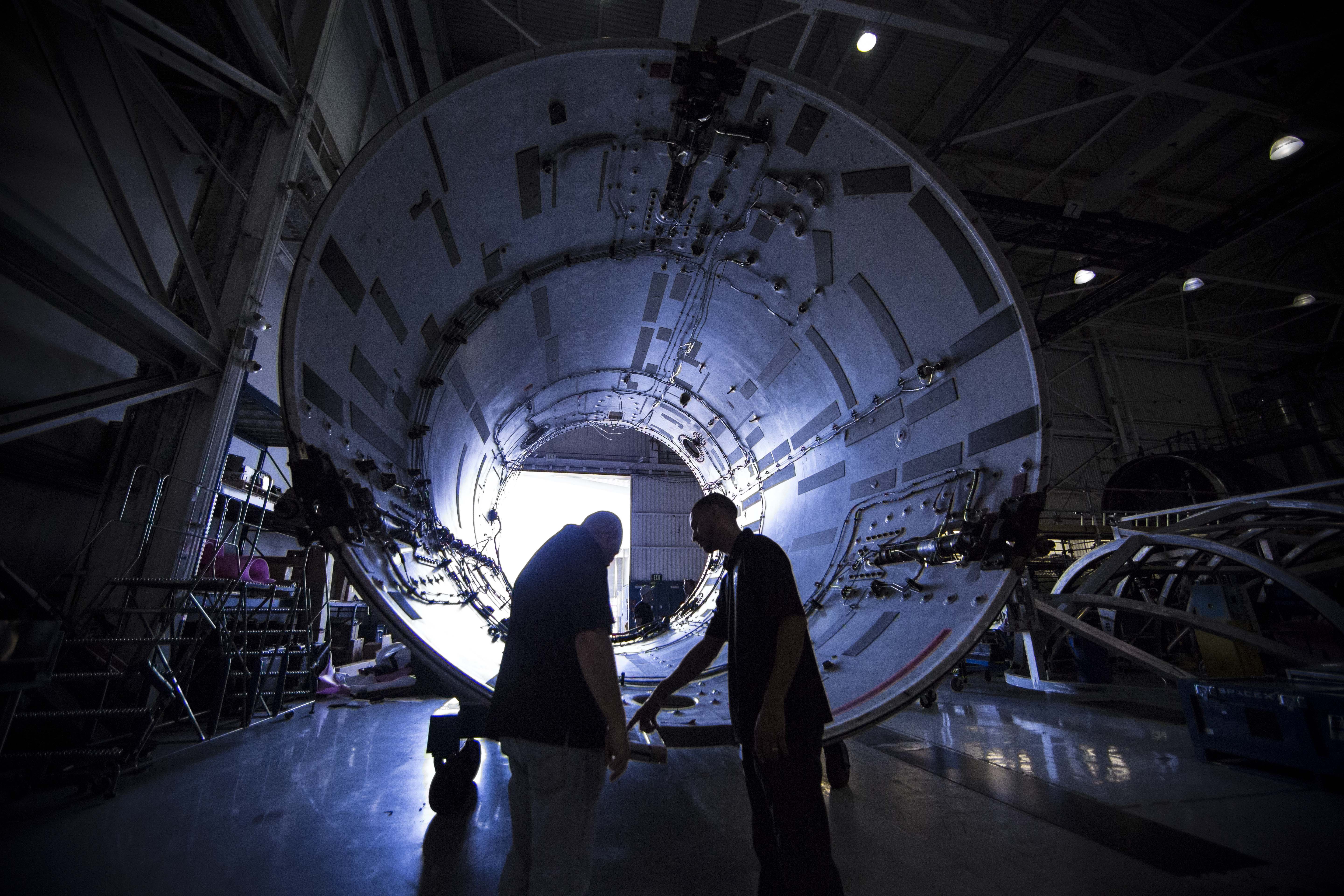 The inter-stage of a SpaceX Falcon 9 rocket inside the company's manufacturing facility. SpaceX is developing its Crew Dragon spacecraft and Falcon 9 rocket in partnership with NASA's Commercial Crew Program to carry astronauts to and from the International Space Station.