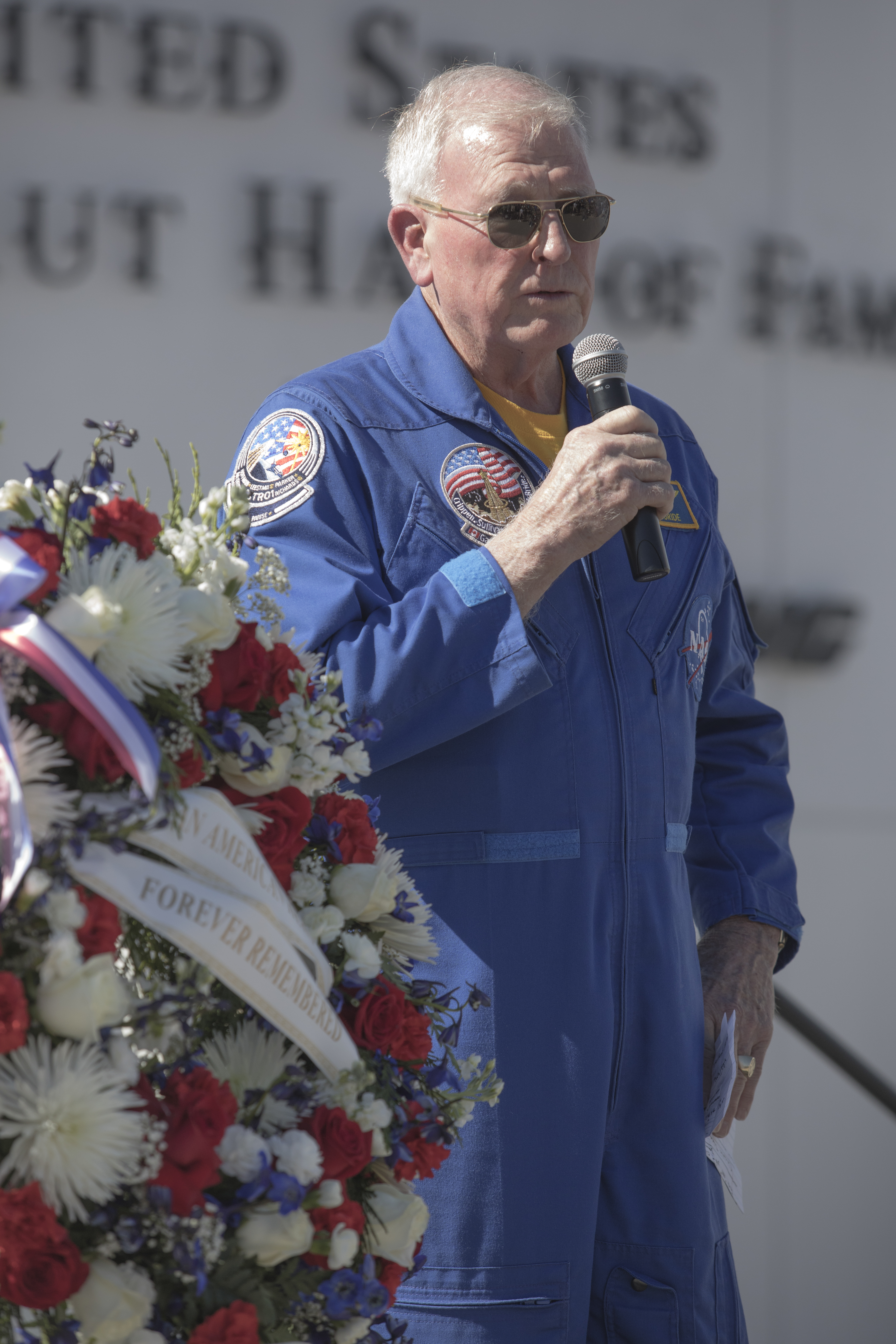 Former NASA astronaut Jon McBride speaks during a ceremony at the Heroes and Legends exhibit at the Kennedy Space Center Visitor Complex. The brief memorial honoring NASA astronaut John Young took place on the afternoon of Jan. 11, 2018. Young died Jan. 5, 2018, in Houston at the age of 87. He was the only astronaut to fly in NASA's Gemini, Apollo and Space Shuttle Programs.