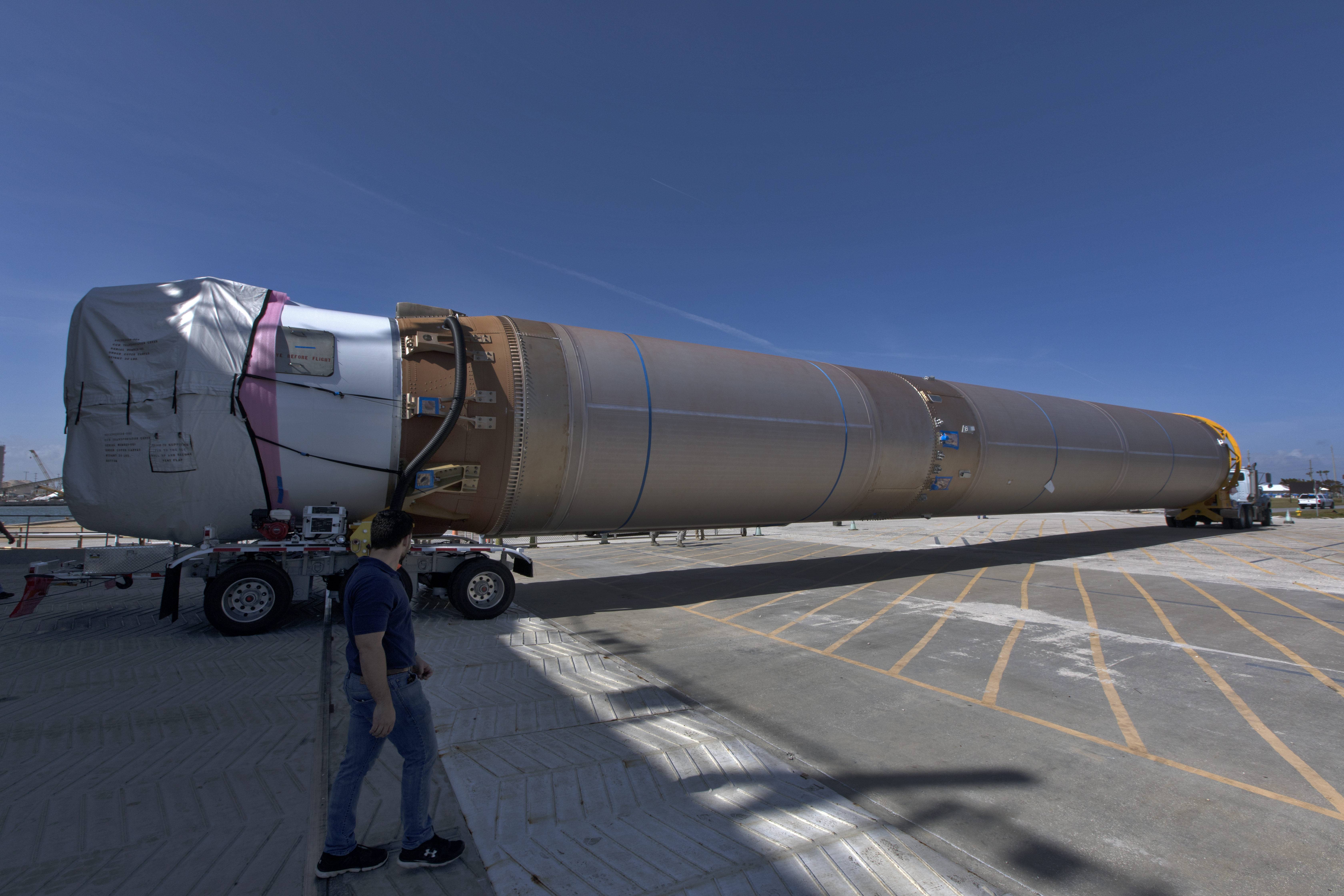 The United Launch Alliance Atlas V booster for NOAA's Geostationary Operational Environmental Satellite-S (GOES-S) is offloaded from the Mariner transport ship at the Army Wharf at Cape Canaveral Air Force Station in Florida. The booster will be transported to the Atlas Spaceflight Operations Center near Space Launch Complex 41 at CCAFS. GOES-S is the second in a series of four advanced geostationary weather satellites. The satellite is slated to launch aboard the Atlas V rocket March 1.