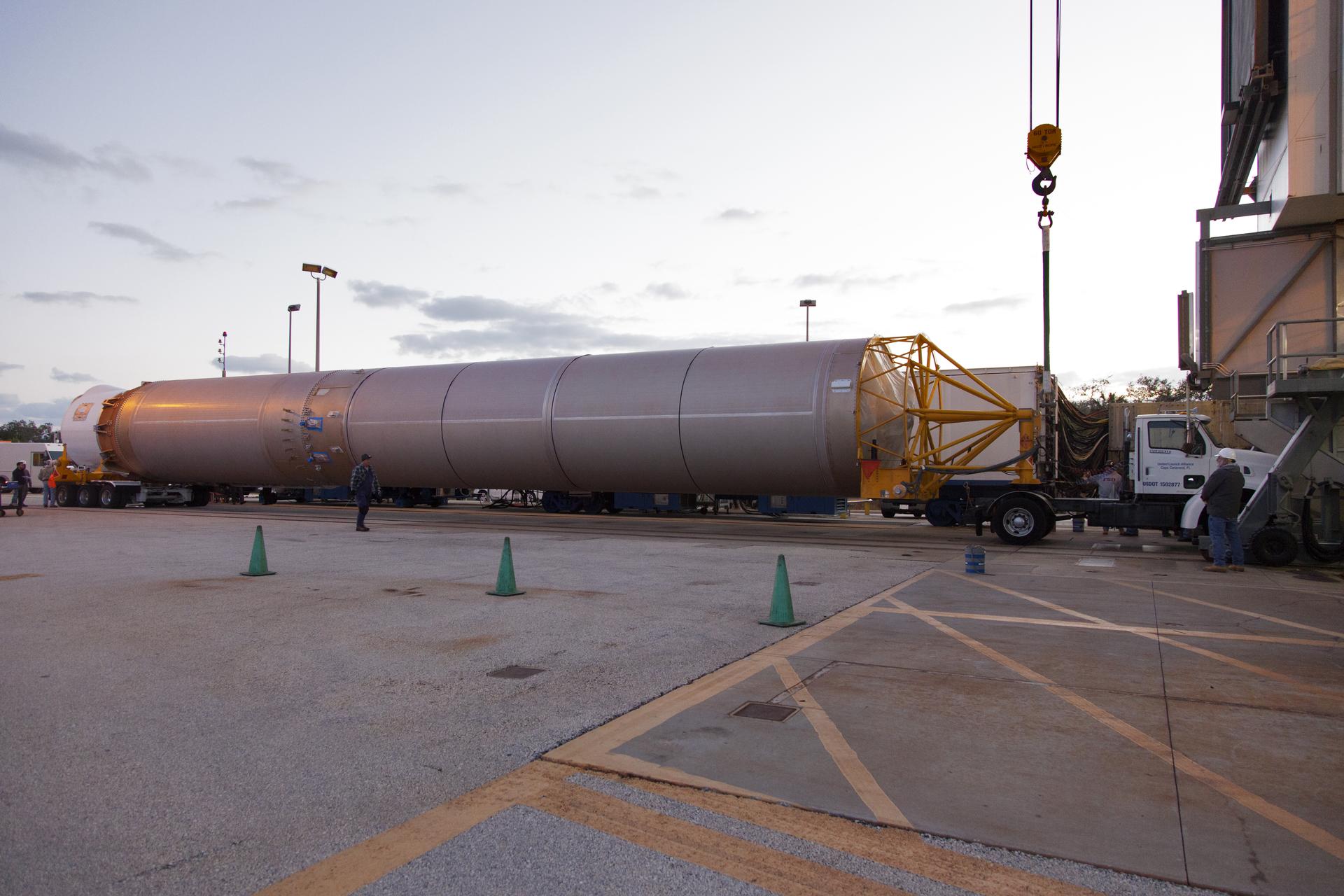 A United Launch Alliance Atlas V first stage arrives at the Vertical Integration Facility at Space Launch Complex 41 at Cape Canaveral Air Force Station in Florida. The rocket will be positioned on its launcher to boost the Geostationary Operational Environmental Satellite, or GOES-S. It will be the second in a series of four advanced geostationary weather satellites and will significantly improve the detection and observation of environmental phenomena that directly affect public safety. GOES-S is slated to launch March 1, 2018.