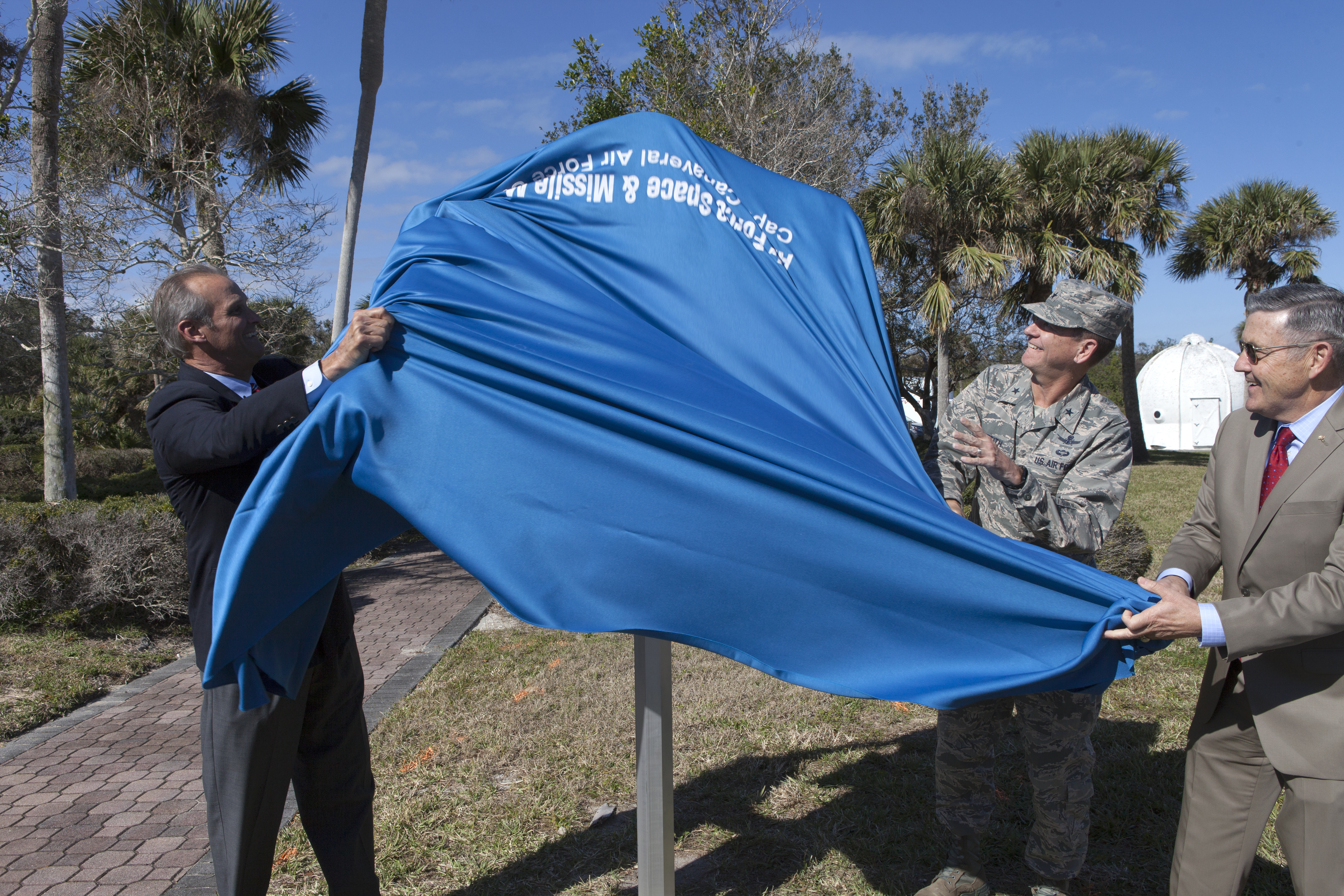 During a ceremony at Cape Canaveral Air Force Station's Space Launch Complex 26 a historical marker is unveiled noting the launch of America's first satellite, Explorer 1. From the left, Ray Sands, chairman of the Air Force Space and Missile Foundation -- sponsor of the marker, Brig. Gen. Wayne Monteith, 45th Space Wing commander and director of the Eastern Range and Kennedy Space Center Director Bob Cabana. The Explorer 1 satellite was launched atop a Jupiter C rocket on Jan. 31, 1958. During operation, the satellite's cosmic ray detector discovered radiation belts around Earth which were named for Dr. James Van Allen, principal investigator for the satellite.