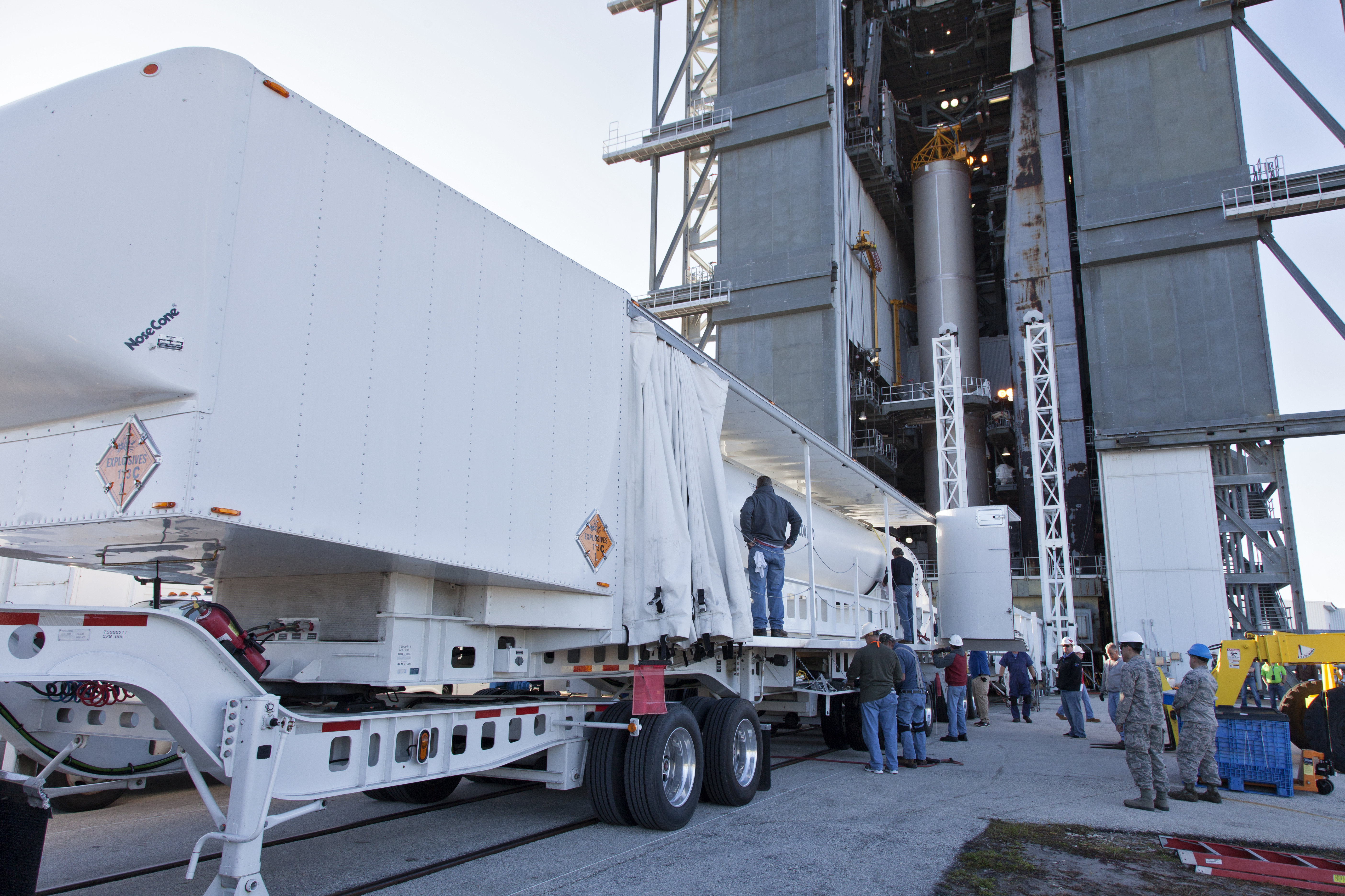 A transport vehicle carrying a solid rocket booster (SRB) arrives at the Vertical Integration Facility at Space Launch Complex 41 at Cape Canaveral Air Force Station in Florida. The SRB will be mated to a United Launch Alliance Atlas V first stage to help boost NOAA's Geostationary Operational Environmental Satellite, or GOES-S, to orbit. GOES-S is the second in a series of four advanced geostationary weather satellites that will significantly improve the detection and observation of environmental phenomena that directly affect public safety, protection of property and the nation's economic health and prosperity. GOES-S is slated to launch March 1, 2018.