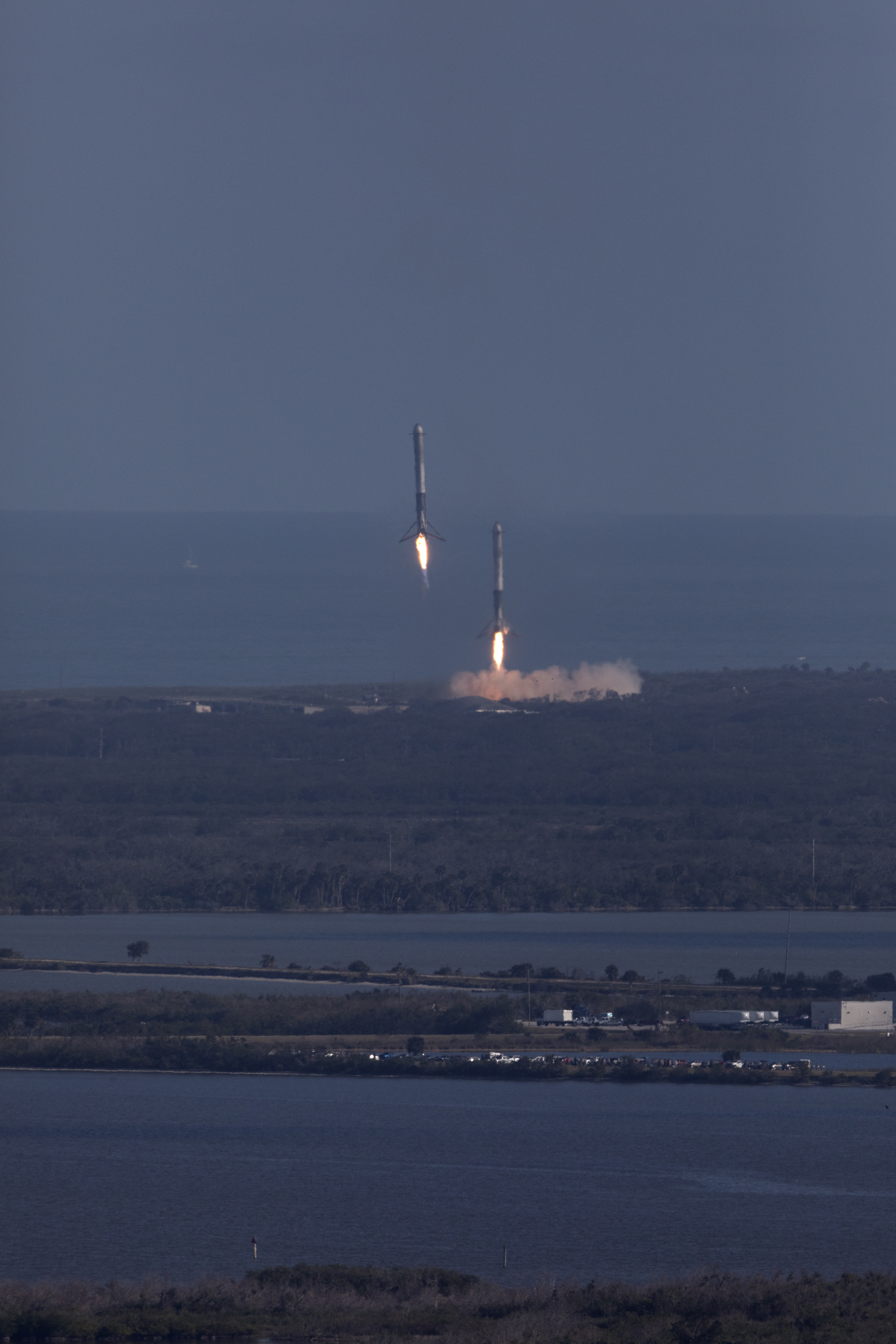 The SpaceX Falcon Heavy rocket’s two side cores descend toward landing at Cape Canaveral Air Force Station in Florida following a successful liftoff at 3:45 p.m. EST from Launch Complex 39A at NASA's Kennedy Space Center. This demonstration flight is a significant milestone for the world's premier multi-user spaceport. In 2014, NASA signed a property agreement with SpaceX for the use and operation of the center's pad 39A, where the company has launched Falcon 9 rockets and prepared for the first Falcon Heavy. NASA also has Space Act Agreements in place with partners, such as SpaceX, to provide services needed to process and launch rockets and spacecraft.