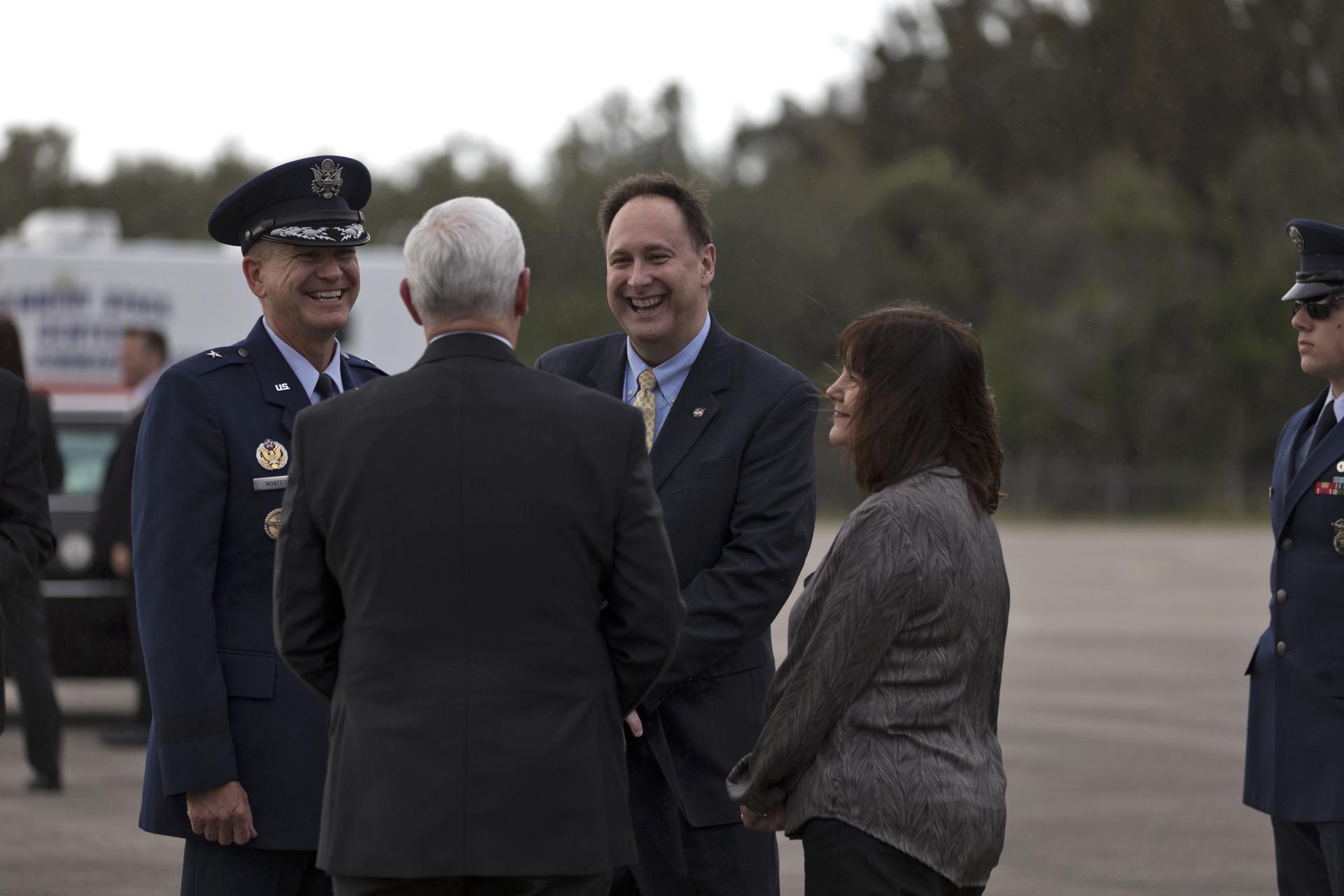 Acting NASA Administrator Robert Lightfoot, center, greets Vice President Mike Pence and his wife, Karen, at the Shuttle Landing Facility at the agency's Kennedy Space Center in Florida, on Feb. 20, 2018. During his visit, Pence will chair a meeting of the National Space Council in the high bay of the center's Space Station Processing Facility. The council's role is to advise the president regarding national space policy and strategy, and review the nation's long-range goals for space activities.