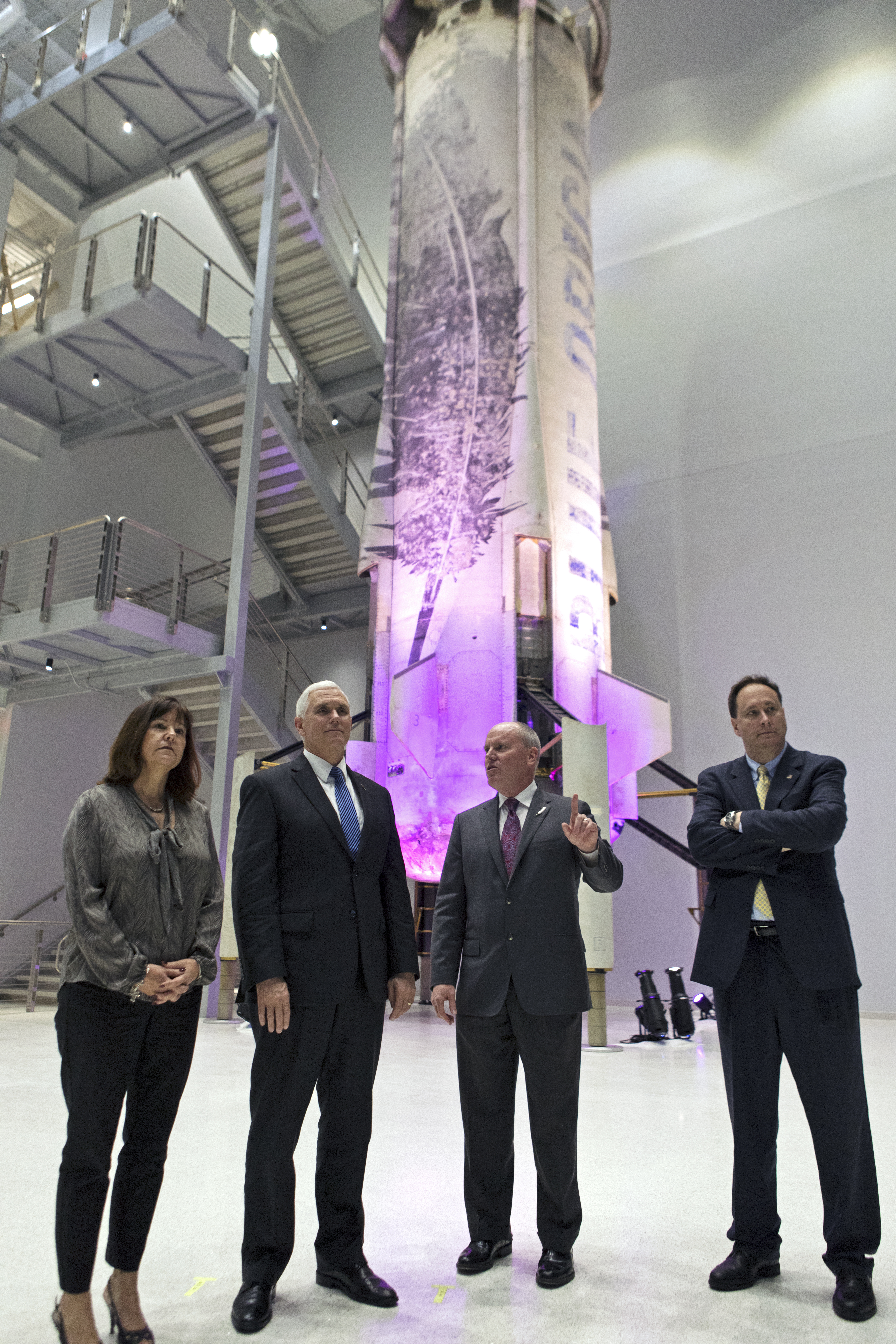 Vice President Mike Pence, second from left, tours the Blue Origin Manufacturing Facility near NASA's Kennedy Space Center in Florida, on Feb. 20, 2018. From left, are Karen Pence, Blue Origin CEO Robert Smith, and acting NASA Administrator Robert Lightfoot. Vice President Pence viewed the flown New Shepard Booster and Crew Capsule. The booster was the first launch vehicle with a successful vertical takeoff and vertical landing to demonstrate reusability. During his visit, Pence will chair a meeting of the National Space Council on Feb. 21, 2018 in the high bay of NASA Kennedy Space Center's Space Station Processing Facility. The council's role is to advise the president regarding national space policy and strategy, and review the nation's long-range goals for space activities.