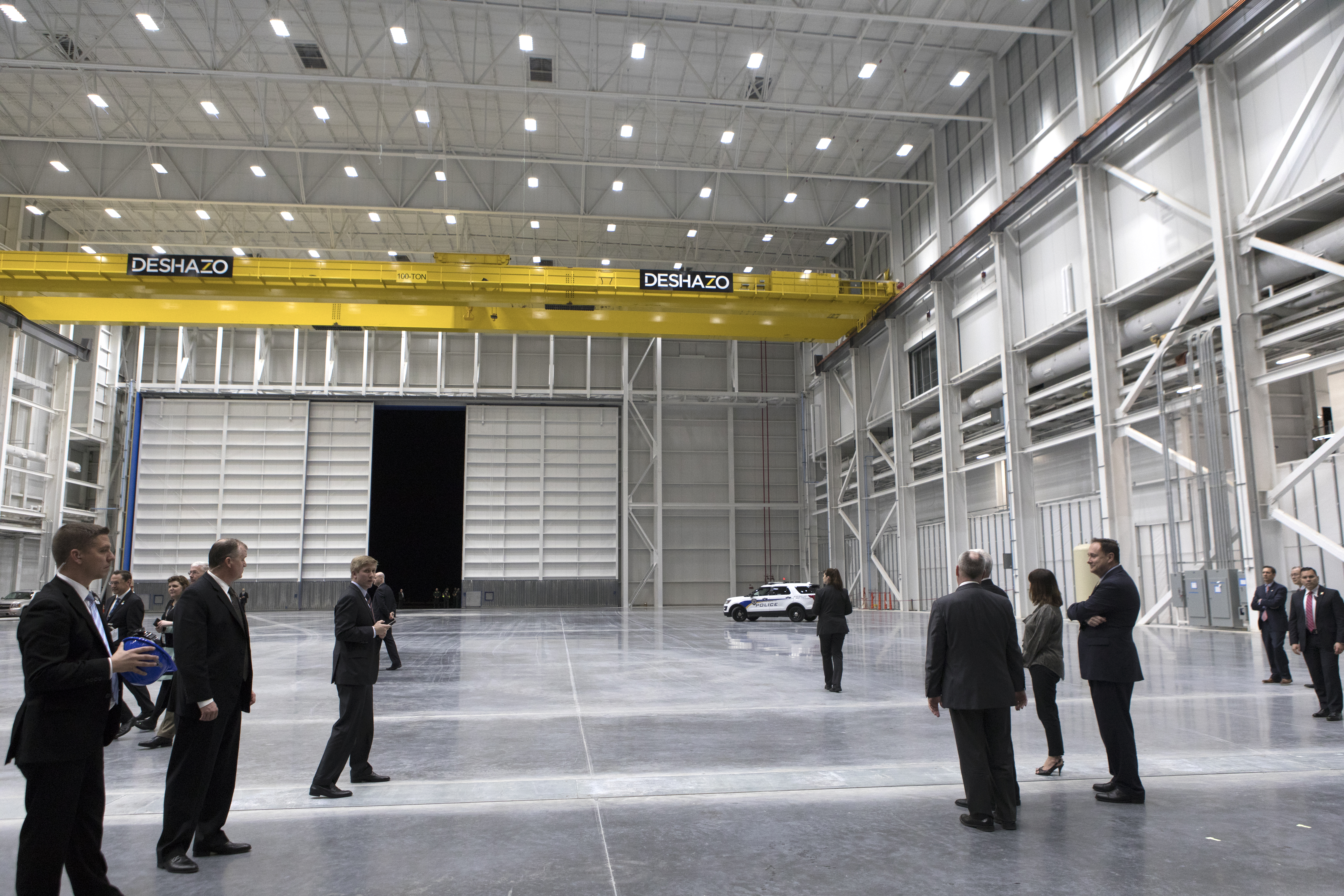 Vice President Mike Pence, hidden at right, tours the Blue Origin Manufacturing Facility near NASA's Kennedy Space Center in Florida, on Feb. 20, 2018. At far right is the vice president's wife, Karen Pence. Behind her at right are Blue Origin CEO Robert Smith, and acting NASA Administrator Robert Lightfoot. Vice President Pence viewed the flown New Shepard Booster and Crew Capsule. The booster was the first launch vehicle with a successful vertical takeoff and vertical landing to demonstrate reusability. During his visit, Pence will chair a meeting of the National Space Council on Feb. 21, 2018 in the high bay of NASA Kennedy Space Center's Space Station Processing Facility. The council's role is to advise the president regarding national space policy and strategy, and review the nation's long-range goals for space activities.