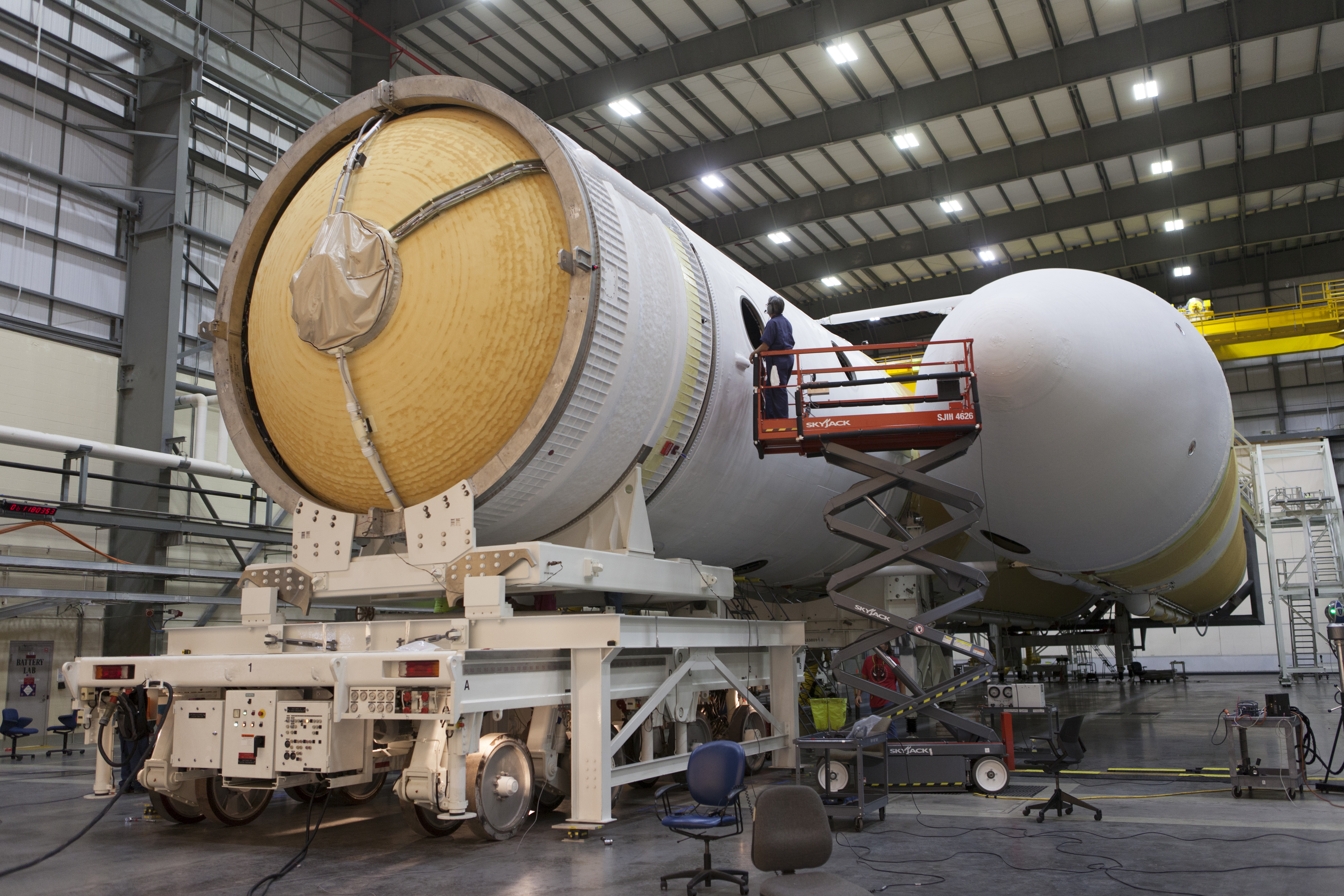 A United Launch Alliance (ULA) worker on a scissor lift watches as the second stage of a ULA Delta IV Heavy is mated to the common booster core inside the Horizontal Integration Facility near Space Launch Complex 37 at Cape Canaveral Air Force Station in Florida. The Delta IV Heavy will launch NASA's upcoming Parker Solar Probe mission in July 2018. The mission will perform the closest-ever observations of a star when it travels through the Sun's atmosphere, called the corona. The probe will rely on measurements and imaging to revolutionize our understanding of the corona and the Sun-Earth connection.