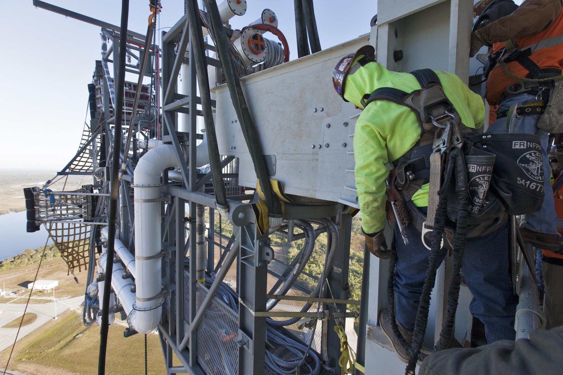 Construction workers with JP Donovan install the Interim Cryogenic Propulsion Stage Umbilical (ICPSU) at about the 240-foot-level of the mobile launcher (ML) tower at NASA's Kennedy Space Center in Florida. The last of the large umbilicals to be installed, the ICPSU will provide super-cooled hydrogen and liquid oxygen to the Space Launch System (SLS) rocket's interim cryogenic propulsion stage, or upper stage, at T-0 for Exploration Mission-1. The umbilical is located at about the 240-foot-level of the mobile launcher and will supply fuel, oxidizer, gaseous helium, hazardous gas leak detection, electrical commodities and environment control systems to the upper stage of the SLS rocket during launch. Exploration Ground Systems is overseeing installation of the umbilicals on the ML.