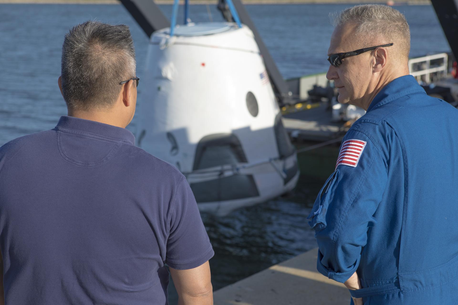 At Cape Canaveral Air Force Station's Naval Ordnance Test Unit basin in Florida, Commercial Crew Program astronaut Doug Hurley, right, observes operation of the SpaceX recovery ship. During a recent visit to the Kennedy Space Center, the crew members were given an up-close look at preparations for the SpaceX Crew Dragon flight tests.