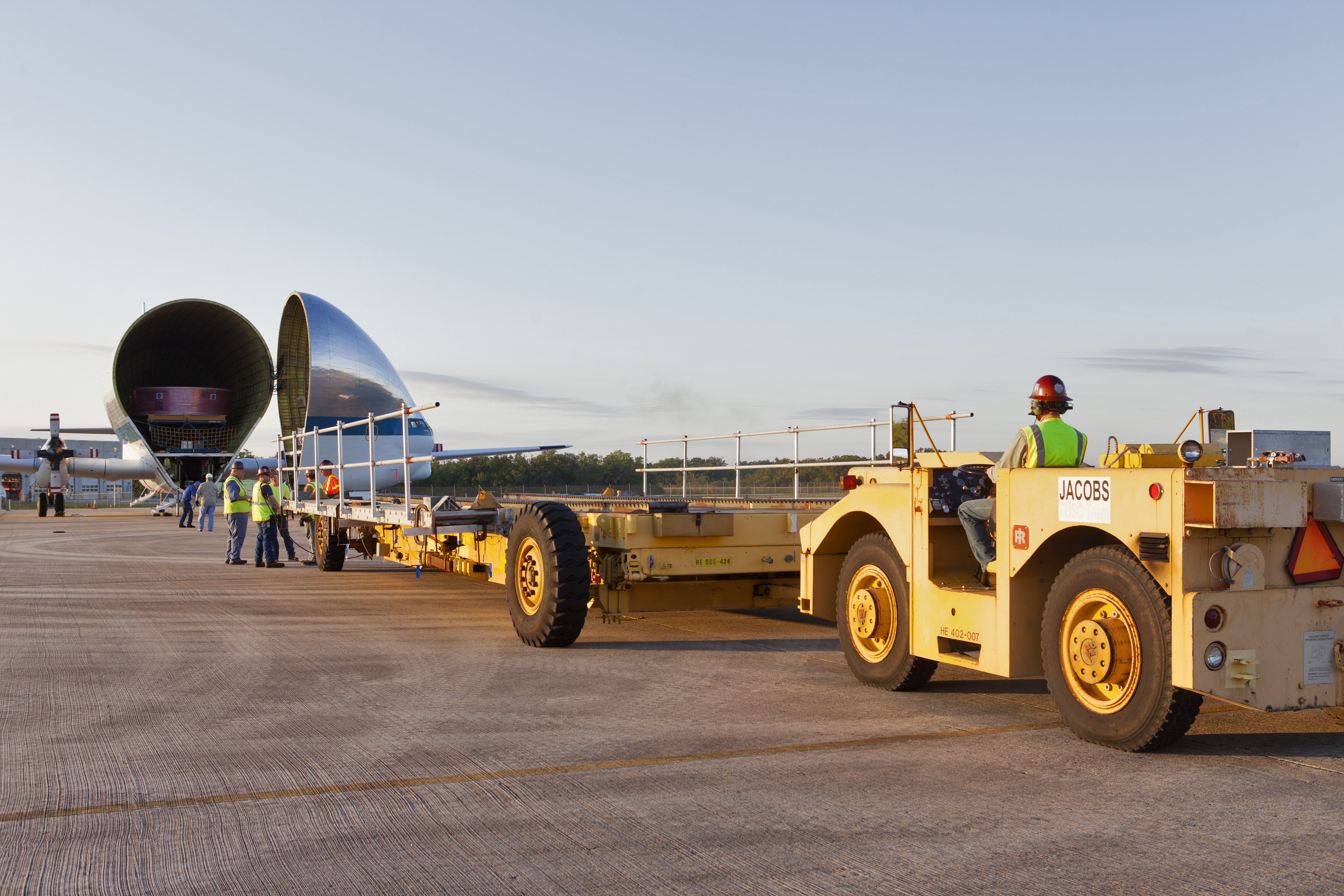 After arriving at the Shuttle Landing Facility at NASA's Kennedy Space Center in Florida, the agency's Super Guppy aircraft was opened to begin offloading the Orion Stage Adapter (OSA), the second flight-hardware section of NASA's Space Launch System (SLS) rocket to arrive at Kennedy. The OSA will be moved out of the Super Guppy and lowered onto a flatbed transporter. The OSA will connect the Orion spacecraft to the upper part of the SLS, the interim cryogenic propulsion stage (ICPS). Both the OSA and ICPS are being stored for processing in the center's Space Station Processing Facility in preparation for Exploration Mission-1, the first uncrewed, integrated launch of the SLS rocket and Orion spacecraft.