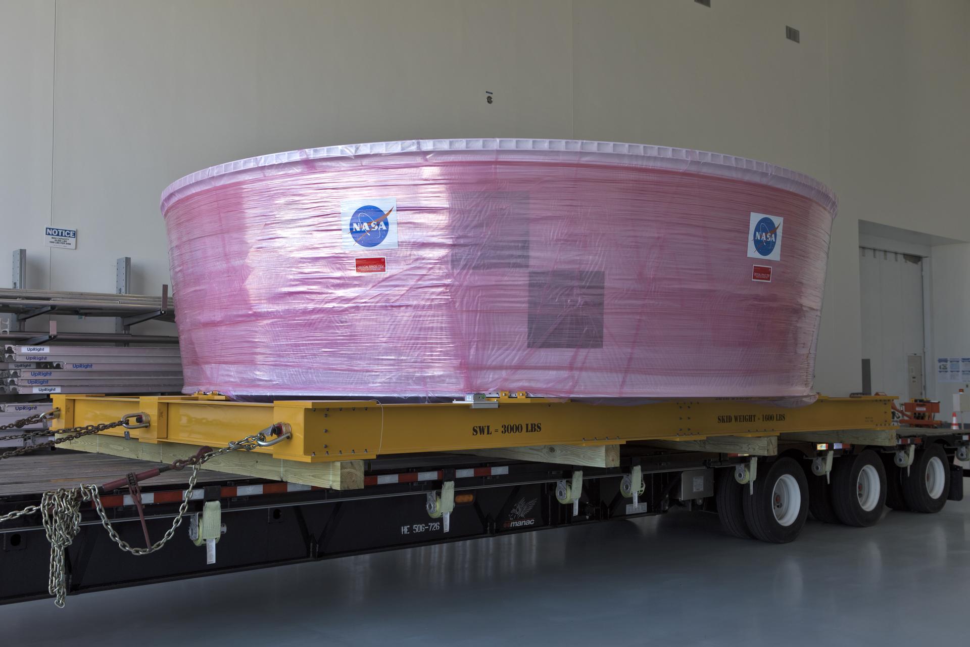 The Orion Stage Adapter (OSA), secured on flatbed transporter, is inside the low bay at the Space Station Processing Facility (SSPF) at NASA's Kennedy Space Center in Florida. The OSA is the second flight-hardware section of the agency's Space Launch System (SLS) rocket to arrive at Kennedy. The OSA will connect the Orion spacecraft to the upper part of the SLS, the interim cryogenic propulsion stage (ICPS). Both the OSA and ICPS are being stored for processing in the SSPF in preparation for Exploration Mission-1, the first uncrewed, integrated launch of the SLS rocket and Orion spacecraft.