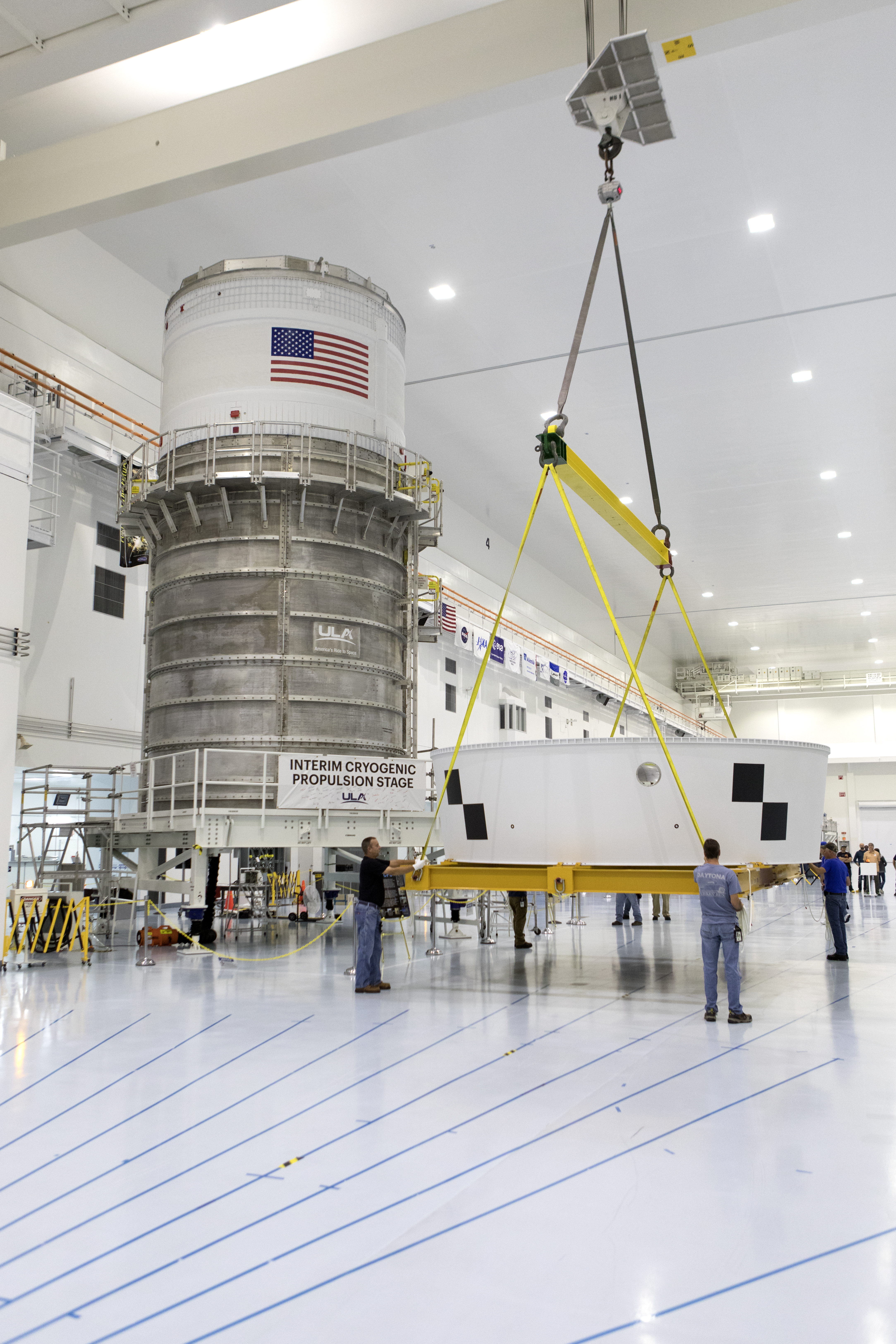 Inside the Space Station Processing Facility (SSPF) high bay at NASA's Kennedy Space Center in Florida, workers assist as a crane moves the Orion Stage Adapter (OSA) to a work area. The OSA is the second flight-hardware section of the agency's Space Launch System (SLS) rocket to arrive at Kennedy. The OSA will connect the Orion spacecraft to the upper part of the SLS, the interim cryogenic propulsion stage (ICPS). Both the OSA and ICPS, at left, are being stored for processing in the center's SSPF in preparation for Exploration Mission-1, the first uncrewed, integrated launch of the SLS rocket and Orion spacecraft.
