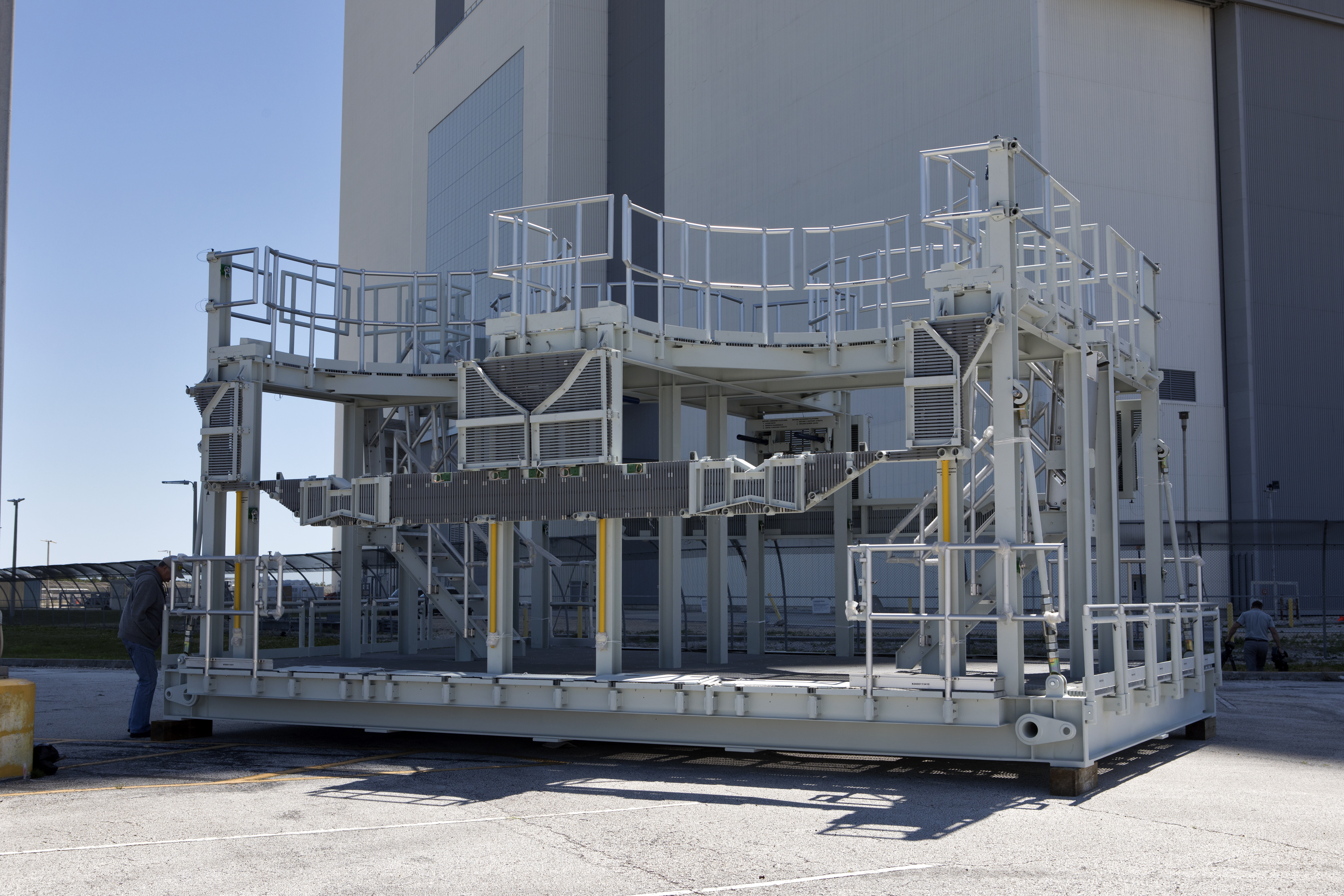 A new service platform for NASA's Space Launch System booster engines is being prepared for the move into the Vehicle Assembly Building (VAB) at the agency's Kennedy Space Center in Florida. The platform was transported from fabricator Met-Con Inc. in Cocoa, Florida. It will be stored in the VAB, and used for processing and checkout of the engines for the rocket's twin five-segment solid rocket boosters for Exploration Mission-1. EM-1 will launch an uncrewed Orion spacecraft to a stable orbit beyond the Moon and bring it back to Earth for a splashdown in the Pacific Ocean.