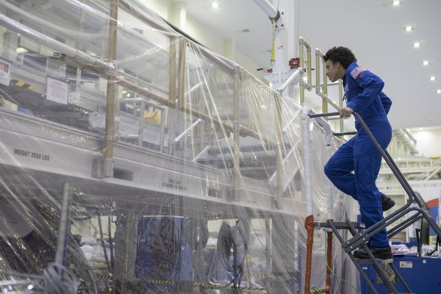 A member of the 2017 class of astronaut candidates views the Orion crew module for Exploration Mission-1 inside the Neil Armstrong Operations and Checkout Building high bay during a familiarization tour at NASA's Kennedy Space Center in Florida. The candidates toured center facilities, including the Vehicle Assembly Building, Launch Pad 39B, the Launch Control Center and the Space Station Processing Facility. They also toured Boeing's Commercial Crew and Cargo Facility, and United Launch Alliance's Space Launch Complex 41 at Cape Canaveral Air Force Station. The candidates will spend about two years getting to know the space station systems and learning how to spacewalk, speak Russian, control the International Space Station's robotic arm and fly T-38s, before they're eligible to be assigned to a mission.
