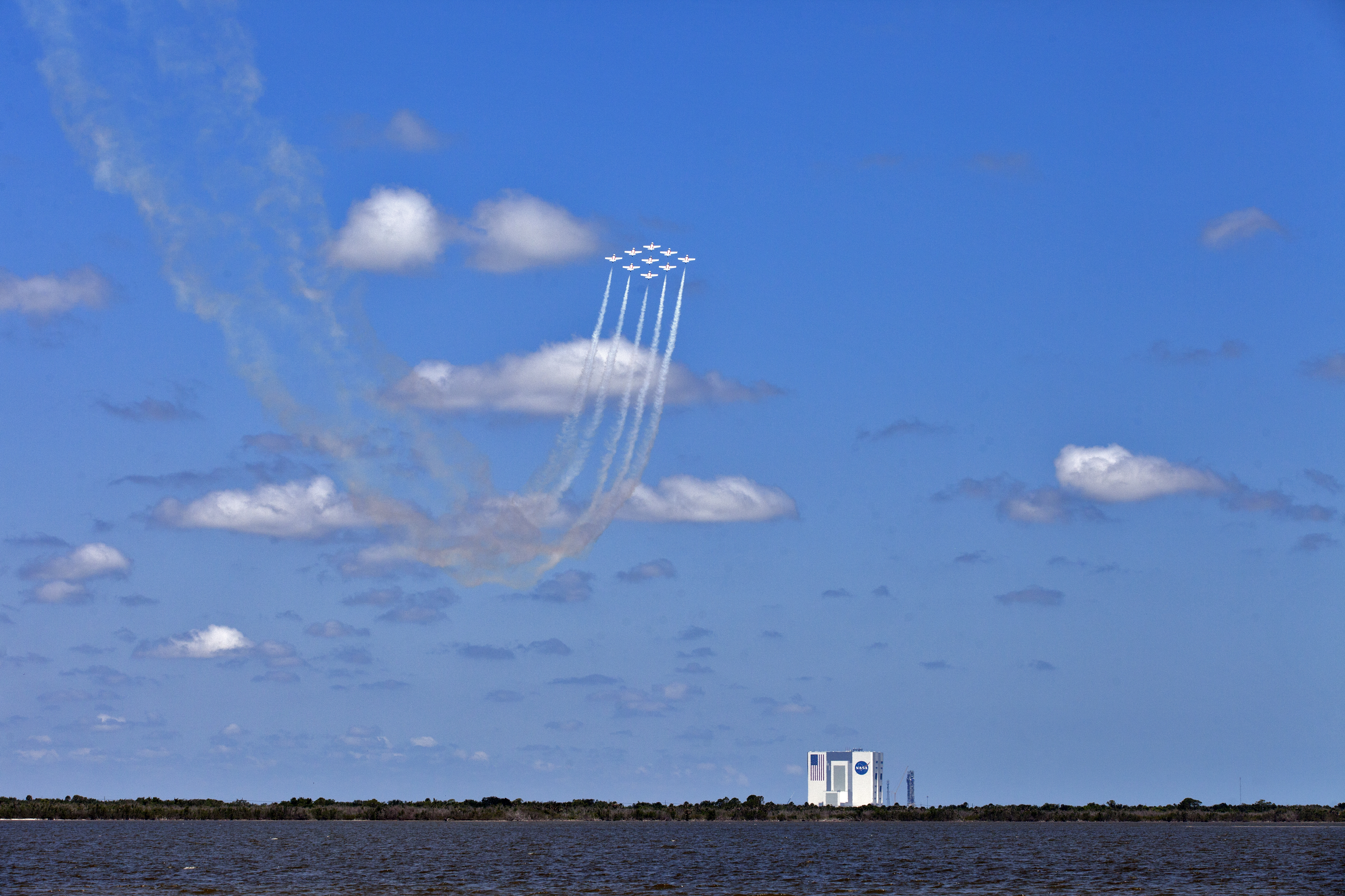 Canadian Forces Snowbirds fly in formation over NASA's Kennedy Space Center in Florida during a practice flight on May 9, 2018, between their scheduled U.S. air shows. The iconic Vehicle Assembly Building and mobile launcher are in view in the background.