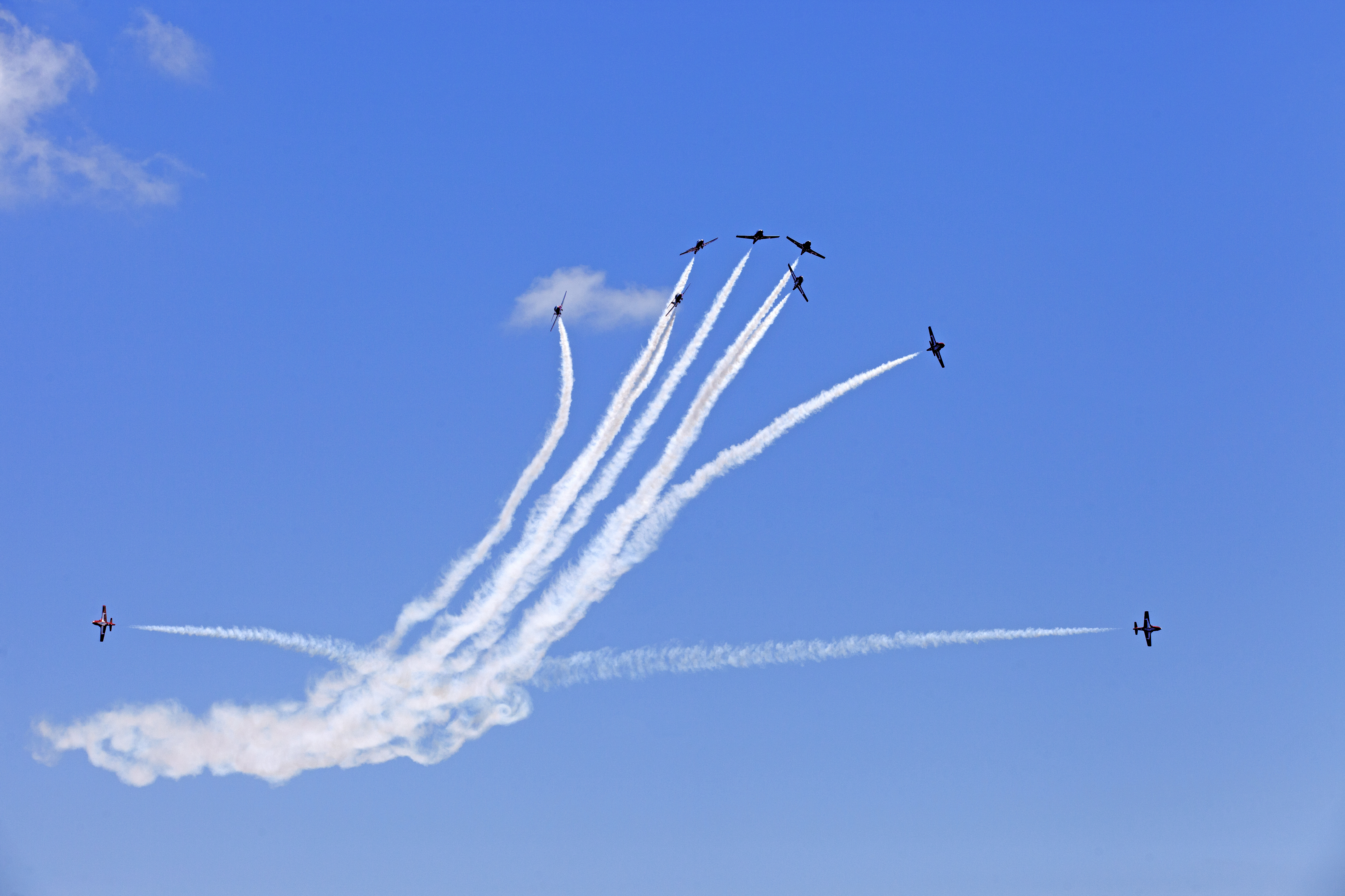 Canadian Forces Snowbirds perform an aerial acrobatic maneuver over NASA's Kennedy Space Center in Florida during a practice flight on May 9, 2018, between their scheduled U.S. air shows.