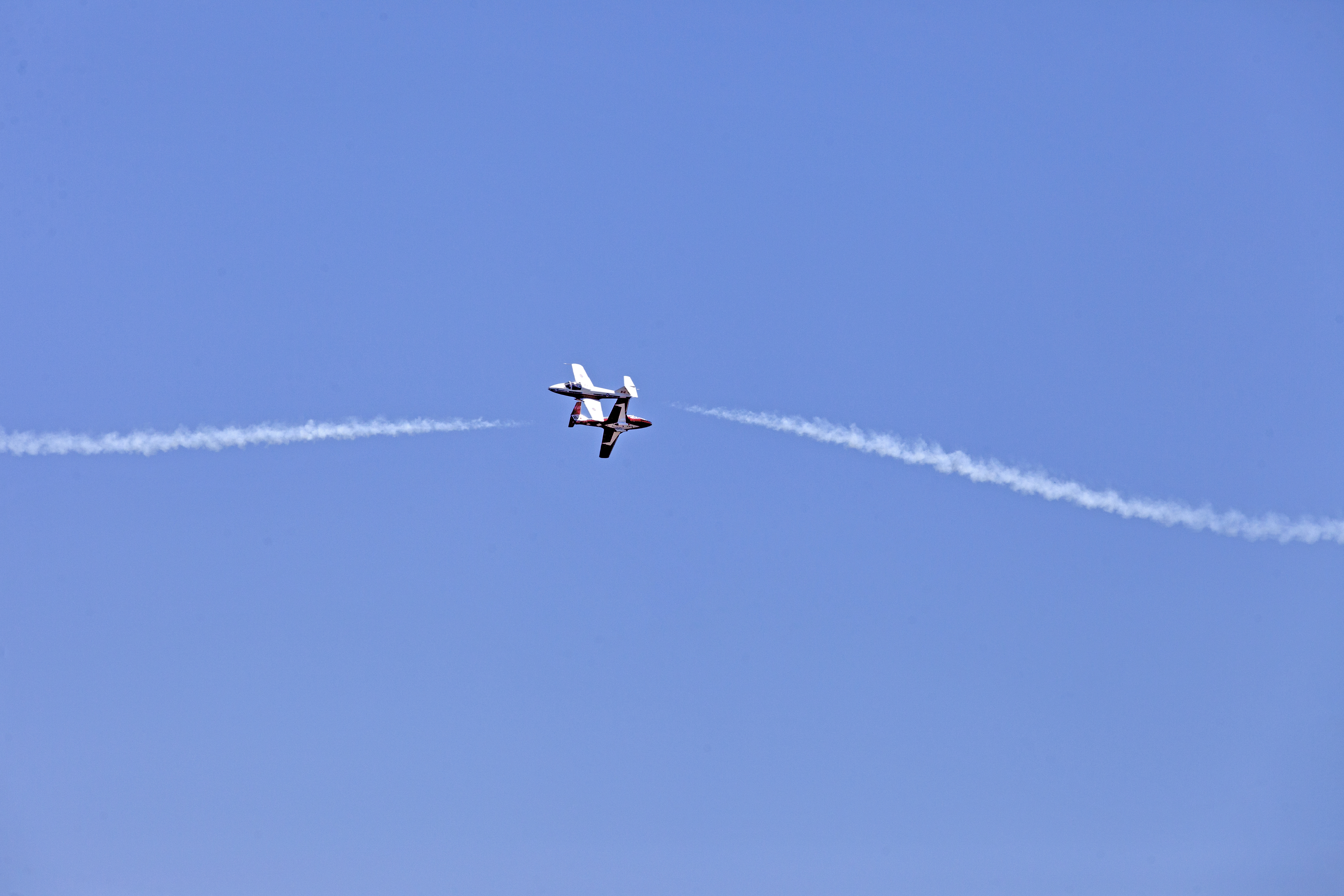Two Canadian Forces Snowbirds perform a close flyby maneuver over NASA's Kennedy Space Center in Florida during a practice flight on May 9, 2018, between their scheduled U.S. air shows.