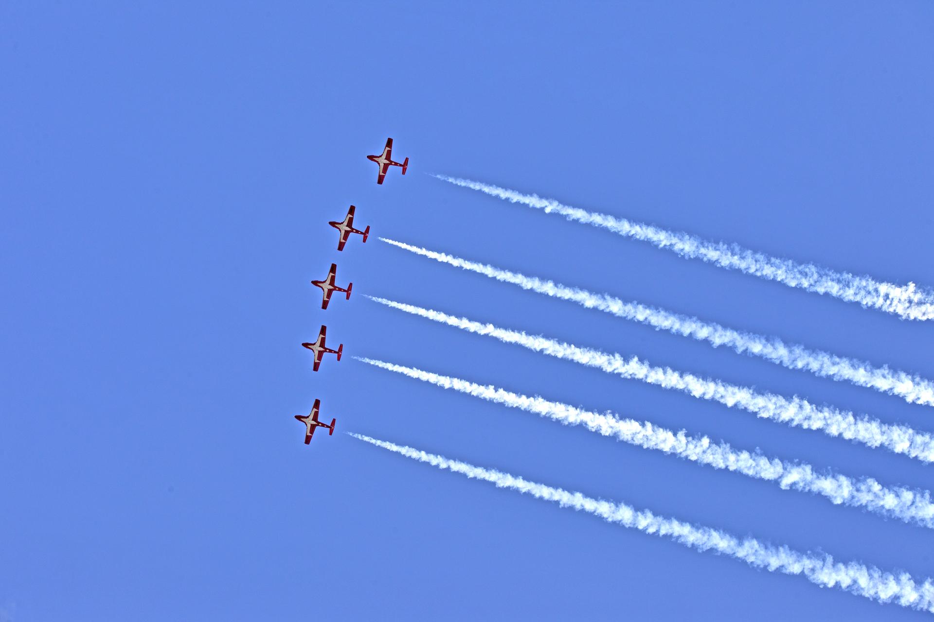 Canadian Forces Snowbirds fly in formation over NASA's Kennedy Space Center in Florida during a practice flight on May 9, 2018, between their scheduled U.S. air shows.