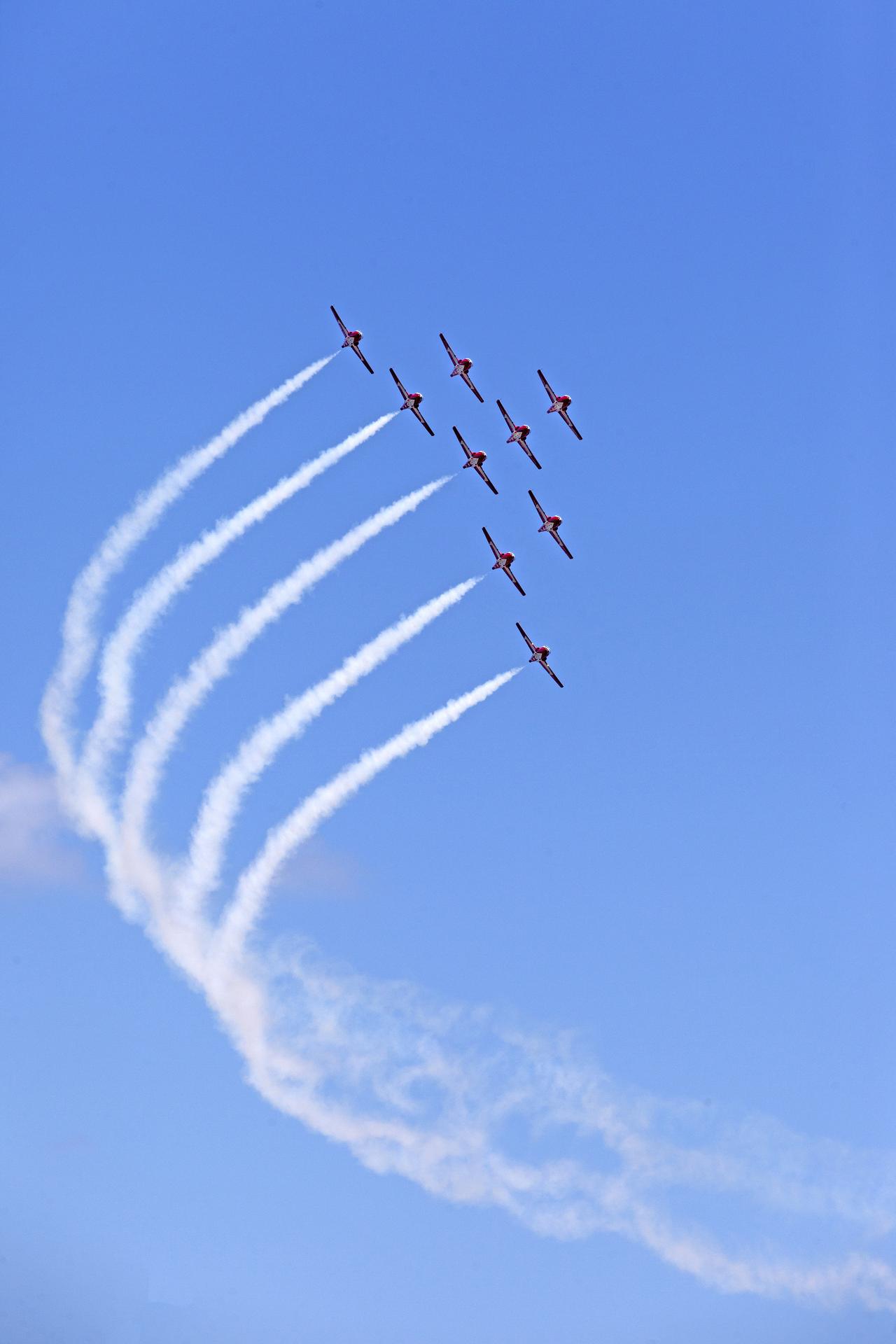 Canadian Forces Snowbirds fly in formation over NASA's Kennedy Space Center in Florida during a practice flight on May 9, 2018, between their scheduled U.S. air shows.