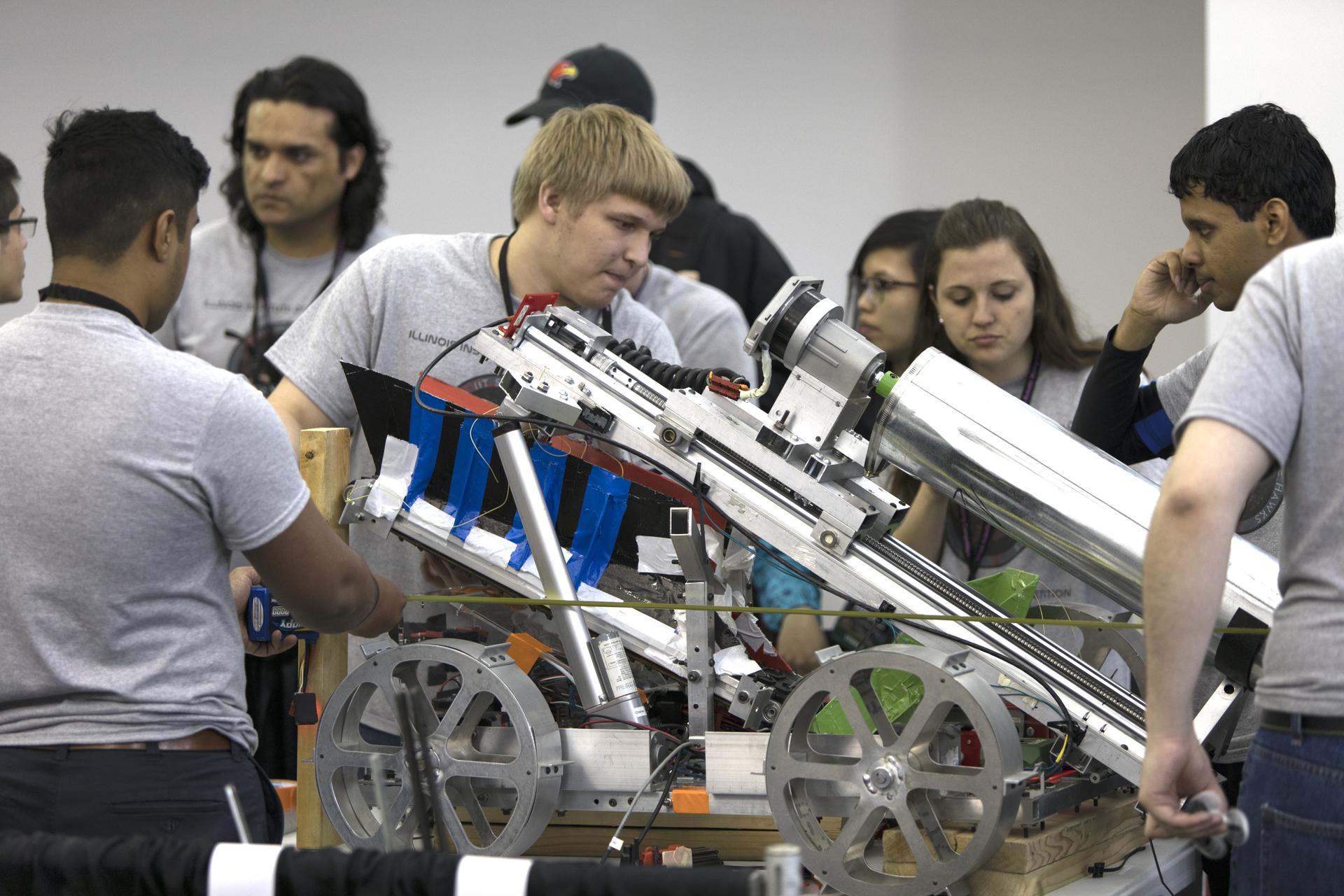 On the first day of NASA's 9th Robotic Mining Competition, set-up day on May 14, team members from the Illinois Institute of Technology work on their robot miner in the RobotPits in the Educator Resource Center at Kennedy Space Center Visitor Complex in Florida. More than 40 student teams from colleges and universities around the U.S. will use their mining robots to dig in a supersized sandbox filled with BP-1, or simulated Lunar soil, gravel and rocks, and participate in other competition requirements. The Robotic Mining Competition is a NASA Human Exploration and Operations Mission Directorate project designed to encourage students in science, technology, engineering and math, or STEM fields. The project provides a competitive environment to foster innovative ideas and solutions that could be used on NASA's deep space missions.