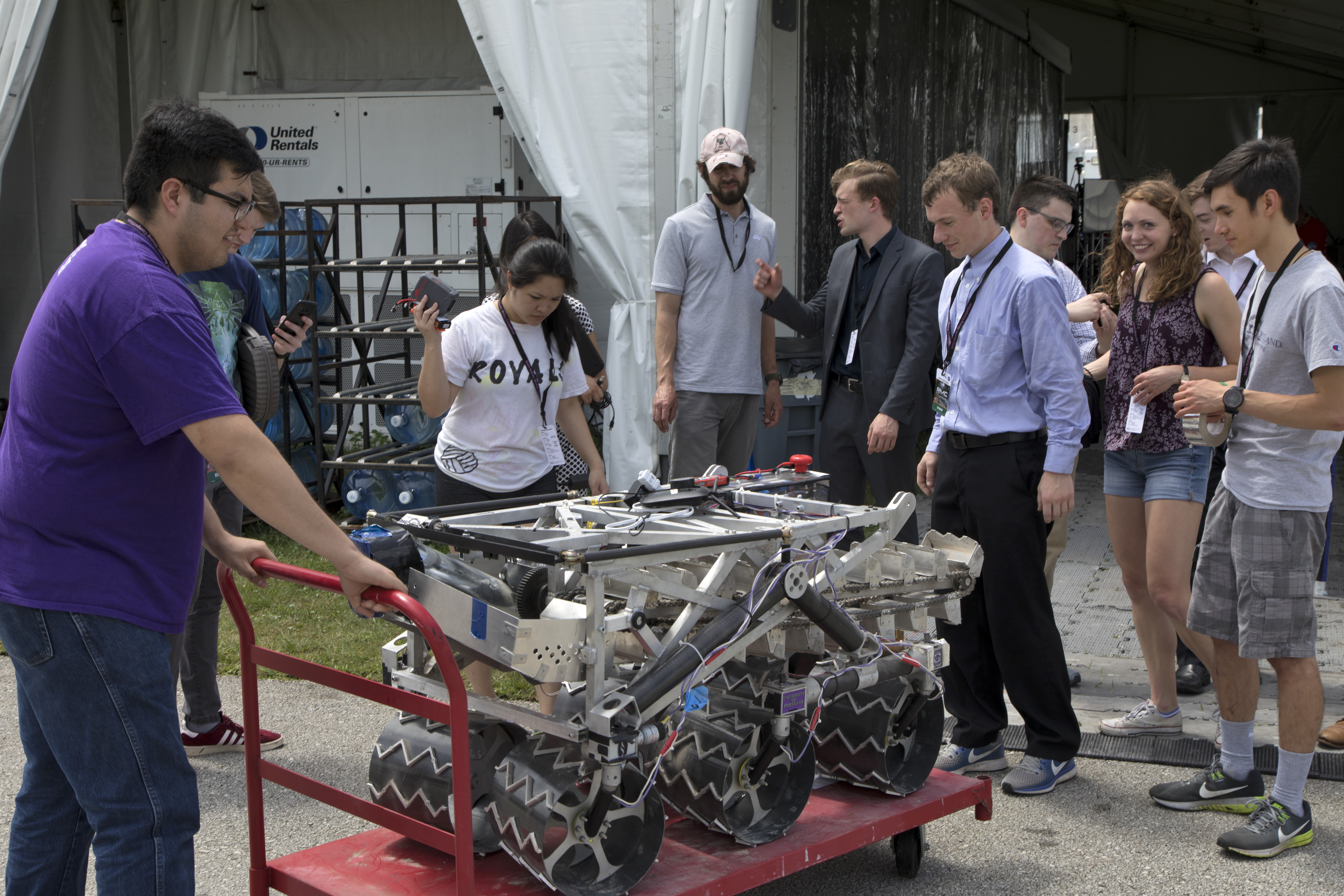 On the third day of NASA's 9th Robotic Mining Competition, May 16, team members from the University of Portland prepare their robot miner for its turn in the mining arena at NASA's Kennedy Space Center Visitor Complex in Florida. More than 40 student teams from colleges and universities around the U.S. will use their mining robots to dig in a supersized sandbox filled with BP-1, or simulated Lunar soil, gravel and rocks, and participate in other competition requirements. The Robotic Mining Competition is a NASA Human Exploration and Operations Mission Directorate project designed to encourage students in science, technology, engineering and math, or STEM fields. The project provides a competitive environment to foster innovative ideas and solutions that could be used on NASA's deep space missions.