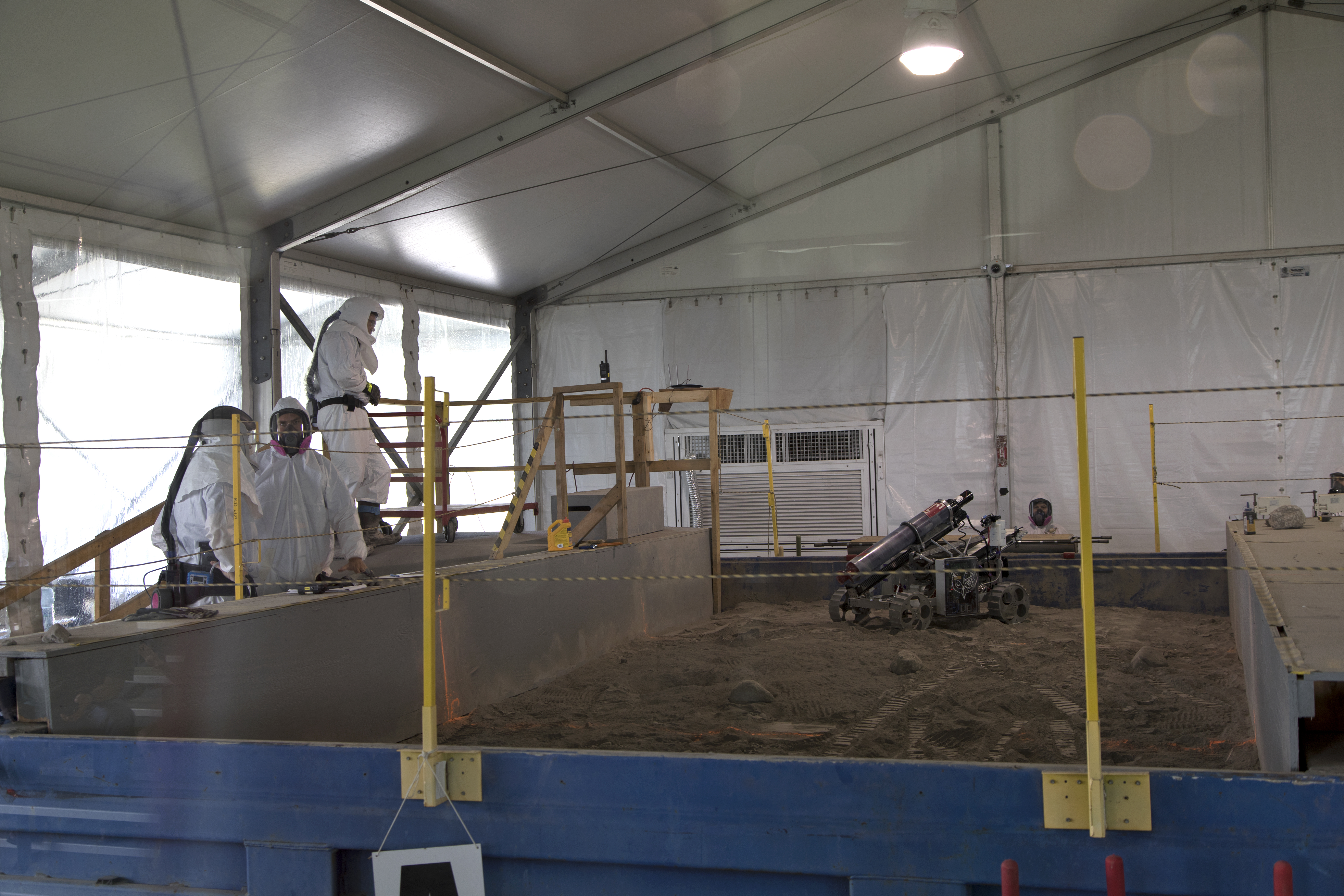On the third day of NASA's 9th Robotic Mining Competition, May 16, judges watch as a robot miner digs in the dirt in the mining arena at NASA's Kennedy Space Center Visitor Complex in Florida. More than 40 student teams from colleges and universities around the U.S. will use their mining robots to dig in a supersized sandbox filled with BP-1, or simulated Lunar soil, gravel and rocks, and participate in other competition requirements. The Robotic Mining Competition is a NASA Human Exploration and Operations Mission Directorate project designed to encourage students in science, technology, engineering and math, or STEM fields. The project provides a competitive environment to foster innovative ideas and solutions that could be used on NASA's deep space missions.