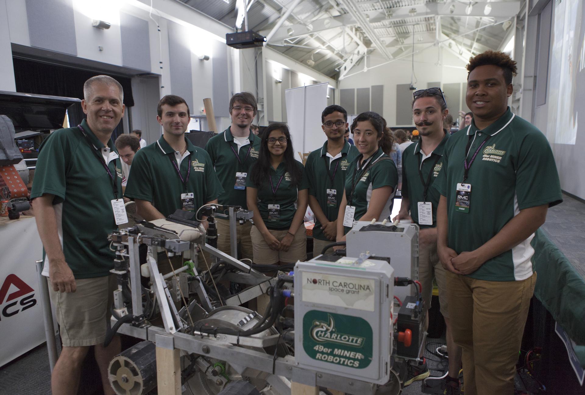 Team members and their faculty advisor, far left, from The University of North Carolina at Charlotte pause with their robot miner in the RobotPits on the fourth day of NASA's 9th Robotic Mining Competition, May 17, at NASA's Kennedy Space Center Visitor Complex in Florida. More than 40 student teams from colleges and universities around the U.S. will use their mining robots to dig in a supersized sandbox filled with BP-1, or simulated Lunar soil, gravel and rocks, and participate in other competition requirements. The Robotic Mining Competition is a NASA Human Exploration and Operations Mission Directorate project designed to encourage students in science, technology, engineering and math, or STEM fields. The project provides a competitive environment to foster innovative ideas and solutions that could be used on NASA's deep space missions.