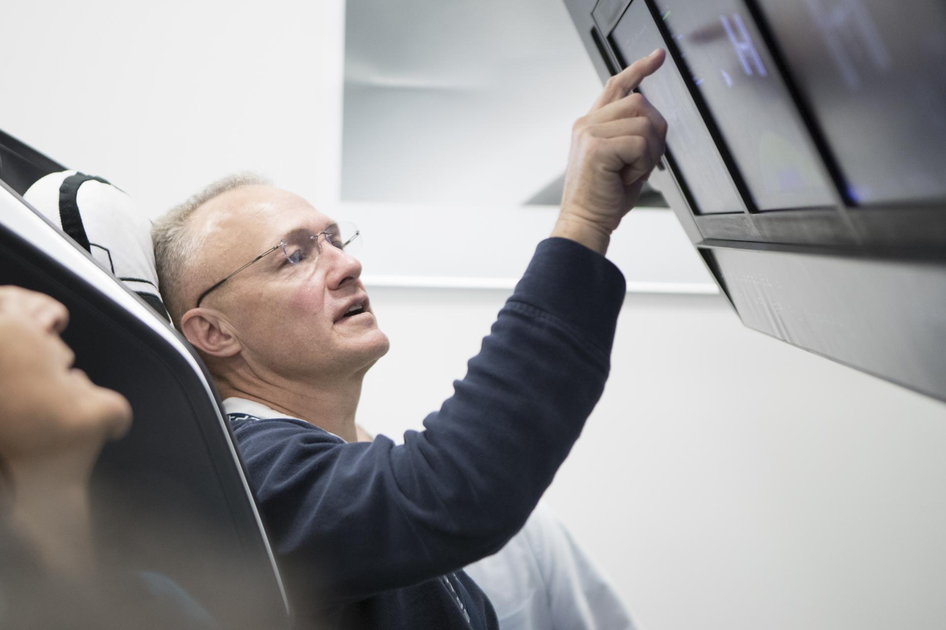 NASA Astronaut Doug Hurley interfaces with the display inside a mock-up of the Crew Dragon spacecraft in Hawthorne, California, during a testing exercise on Tuesday, April 3, 2018.