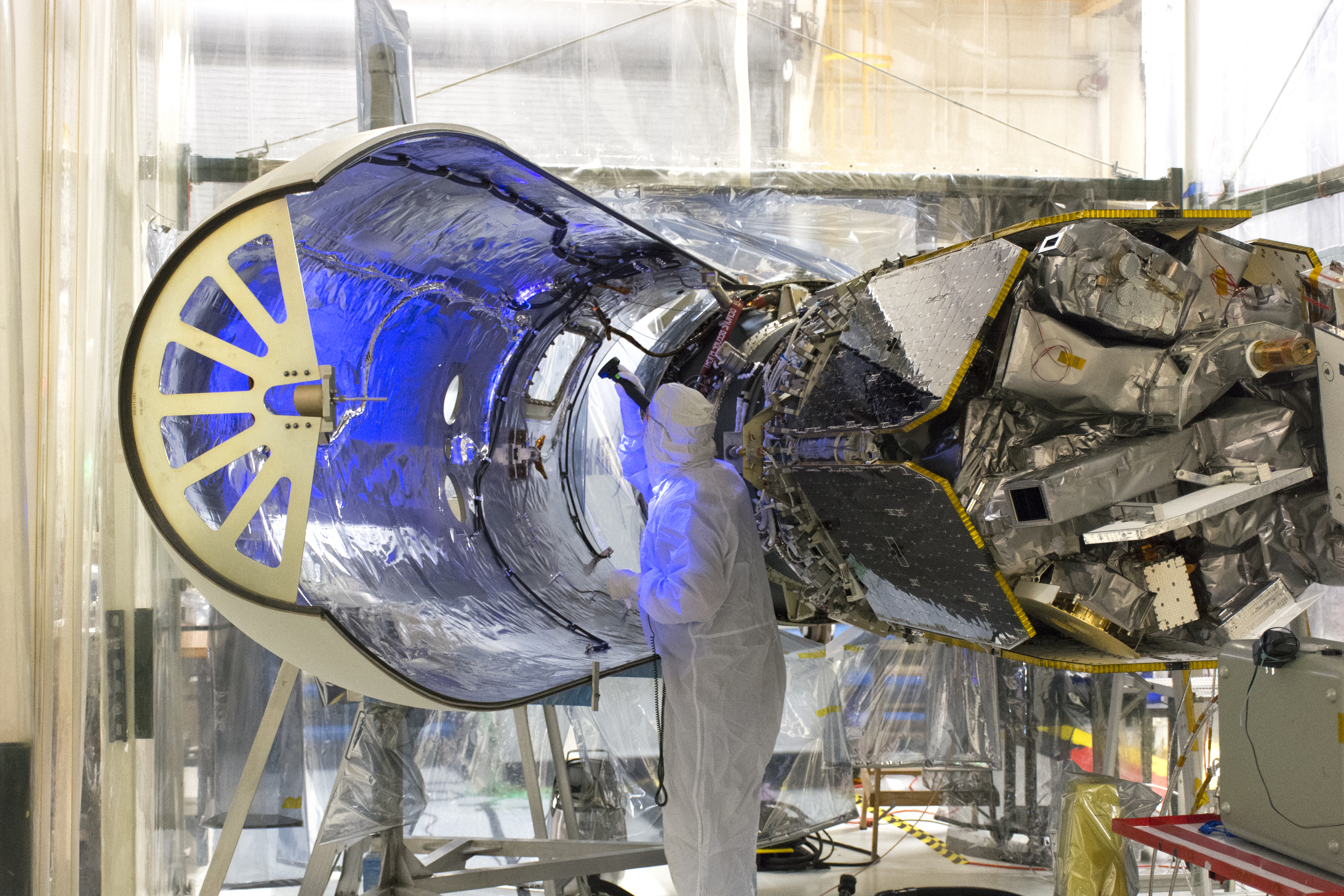 A technician begins a ultraviolet light inspection of the Orbital ATK Pegasus starboard on May 22, 2018, prior to mating NASA's Ionospheric Connection Explorer (ICON) to Pegasus inside Building 1555 at Vandenberg Air Force Base in California. The explorer will launch on June 15, 2018, from Kwajalein Atoll in the Marshall Islands (June 14 in the continental United States) on the Pegasus XL, which is attached to the company's L-1011 Stargazer aircraft. ICON will study the frontier of space - the dynamic zone high in Earth's atmosphere where terrestrial weather from below meets space weather above. The explorer will help determine the physics of Earth's space environment and pave the way for mitigating its effects on our technology and communications systems.