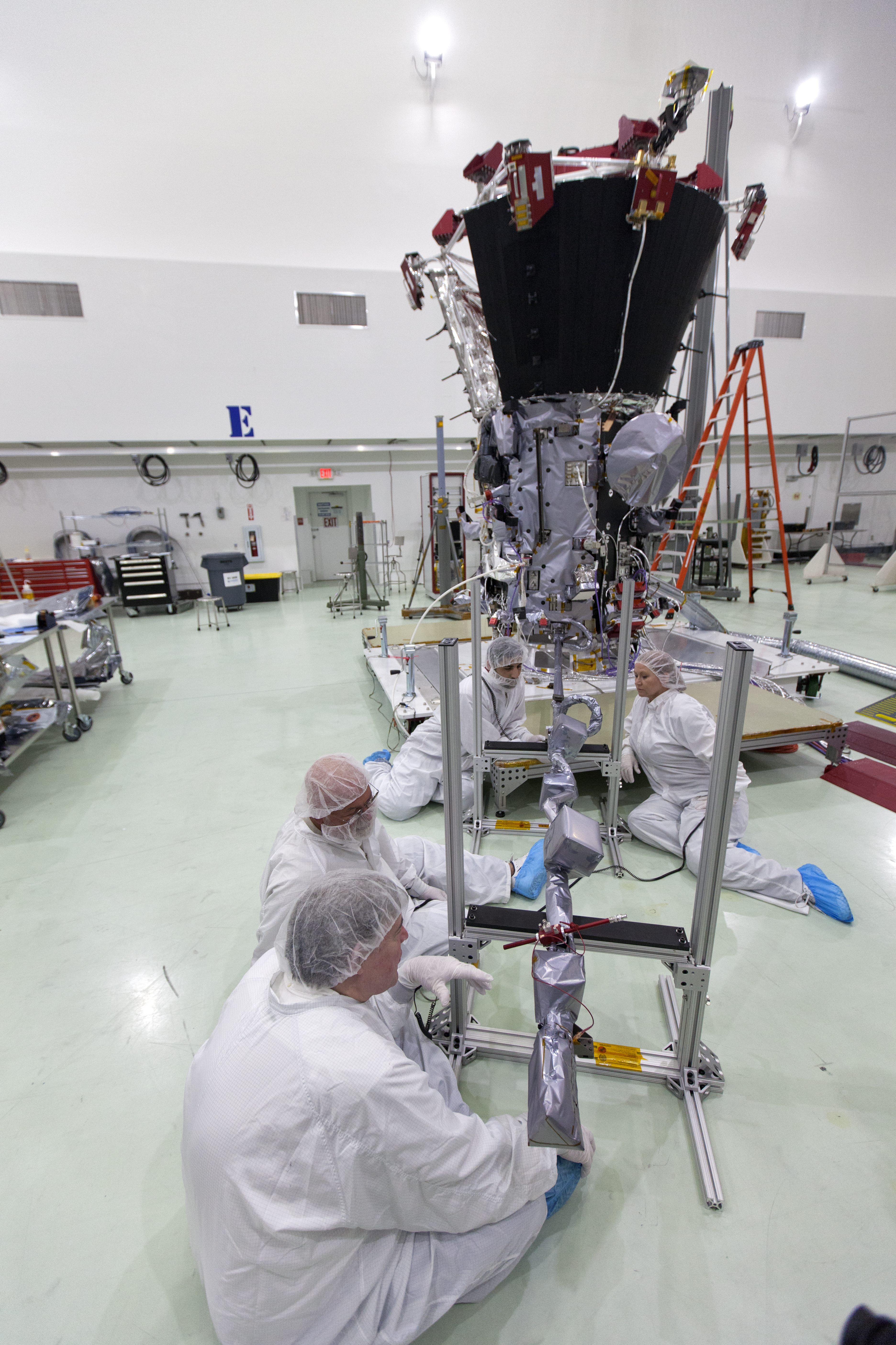 In the Astrotech processing facility in Titusville, Florida, near NASA's Kennedy Space Center, on Wednesday, May 23, 2018, technicians and engineers deploy the magnetometer boom on NASA's Parker Solar Probe. The Parker Solar Probe will launch on a United Launch Alliance Delta IV Heavy rocket from Space Launch Complex 37 at Cape Canaveral Air Force Station in Florida no earlier than Aug. 4, 2018. The mission will perform the closest-ever observations of a star when it travels through the Sun's atmosphere, called the corona. The probe will rely on measurements and imaging to revolutionize our understanding of the corona and the Sun-Earth connection.