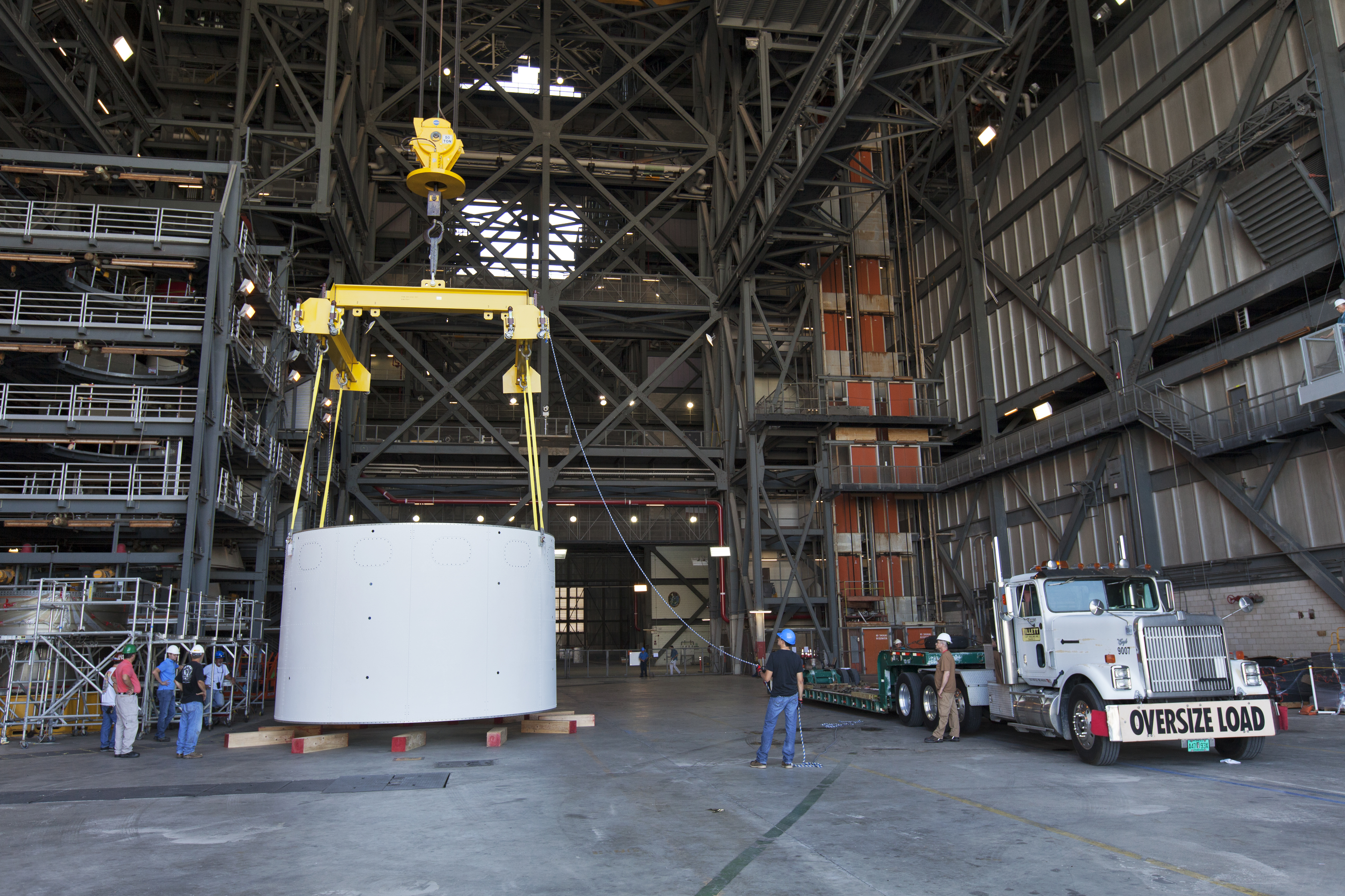 The first of three aeroshells for Orion's Launch Abort System (LAS) is offloaded from its transport truck by crane in High Bay 4 inside the Vehicle Assembly Building at NASA's Kennedy Space Center in Florida, on June 19, 2018. The aeroshell was shipped from EMF Inc. on nearby Merritt Island. The aeroshells will be stacked and prepared for a full-stress test of the LAS, called Ascent Abort-2 (AA-2) flight test, scheduled for April 2019. During the test, a booster will launch from Space Launch Complex 46 at Cape Canaveral Air Force Station, carrying a fully functional LAS and a 22,000-pound Orion test vehicle to an altitude of 31,000 feet and traveling at more than 1,000 miles an hour. The test will verify the LAS can steer the crew module and astronauts aboard to safety in the event of an issue with the Space Launch System (SLS) rocket when the spacecraft is under the highest aerodynamic loads it will experience during a rapid climb into space. Orion is being prepared for its first integrated uncrewed flight atop the SLS on Exploration Mission-1.