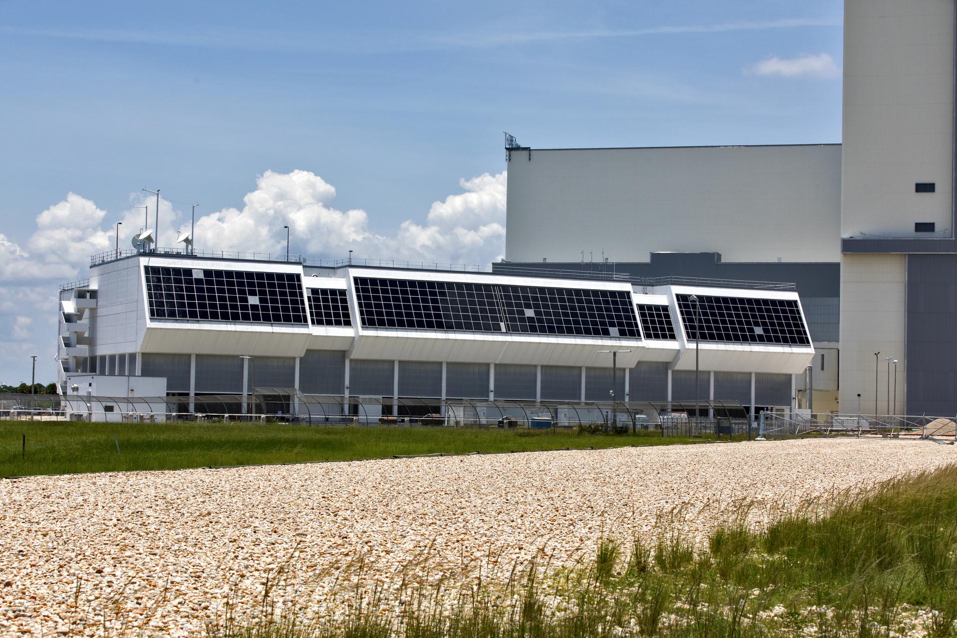 A blue sky and fluffy clouds serve as the backdrop in this view of the exterior of the Launch Control Center (LCC) at NASA's Kennedy Space Center in Florida. The Apollo and shuttle-era firing rooms in the LCC have been upgraded. Exploration Ground Systems upgraded Firing Room 1 to support the launch of NASA's Space Launch System rocket and Orion spacecraft on Exploration Mission-1 and deep space missions.